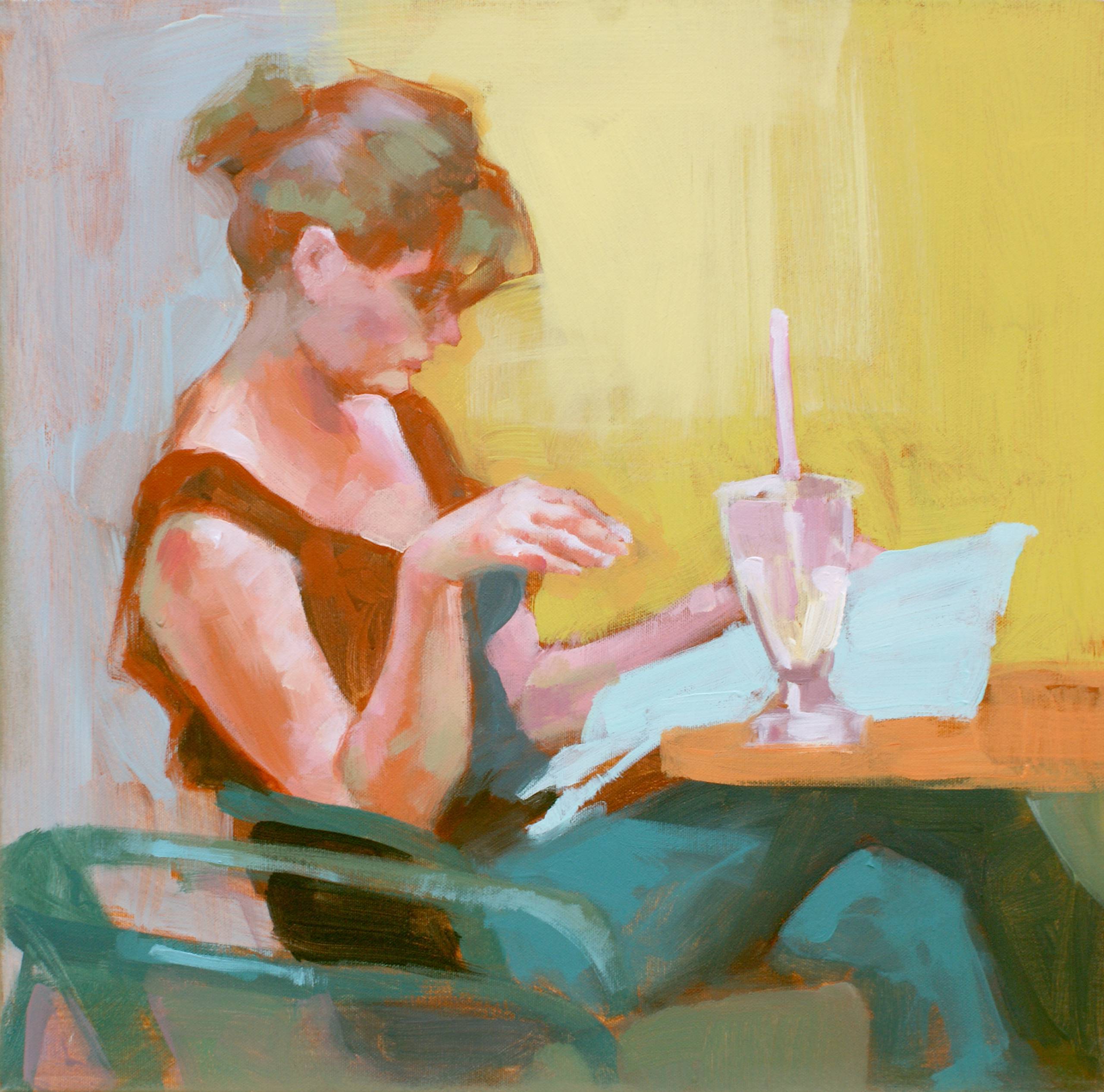 Tytuł - CZYTAJĄCA (nr. 61/2010). Autor - Renata Domagalska. Rok 2010. Technika - akryl na płótnie. Format 50x50 cm.