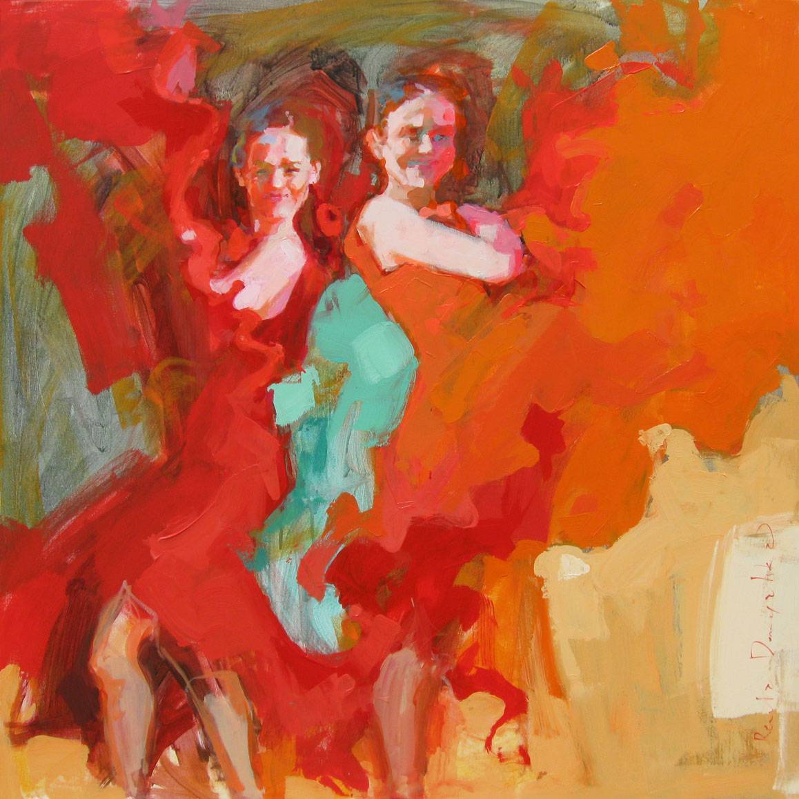 Na tym obrazie dominuje eksplozja kolorów. Intensywne czerwienie i odcienie pomarańczu mieszają się z delikatnym turkusem, tworząc dynamiczną kompozycję. Postacie zdają się tańczyć w rytm muzyki, a ich ruch jest uchwycony w płynnych, niemal abstrakcyjnych formach. Malarskie pociągnięcia pędzla są szerokie i pełne ekspresji, co nadaje dziełu niecodzienny charm. Atmosfera obrazu jest żywa, pełna energii i pasji. Można niemal usłyszeć dźwięki kastanietów i poczuć gorąco hiszpańskiego flamenco. Styl artystyczny jest zdecydowanie impresjonistyczny, z wyraźnym podejściem do uchwycenia chwili i gry światła na tkaninach. To tak jakby artysta chciał, byśmy sami zatańczyli z obrazem. Emocje, które wywołuje, to prawdziwa radość i entuzjazm. Dzieło to przypomina mi o letnich festiwalach, gdzie każdy krok to czysta celebracja życia. Użycie słowa "vibrant" idealnie oddaje tę atmosferę pełną wigoru. Patrząc na obraz, czuję się zainspirowany. Może powinnam sama spróbować tańca? Jak mówiłby 7-latek: te panie są jak ogień! Tyle serca w tym płótnie, a przecież to tylko farby i płótno, a jednak opowiadają tyle historii.