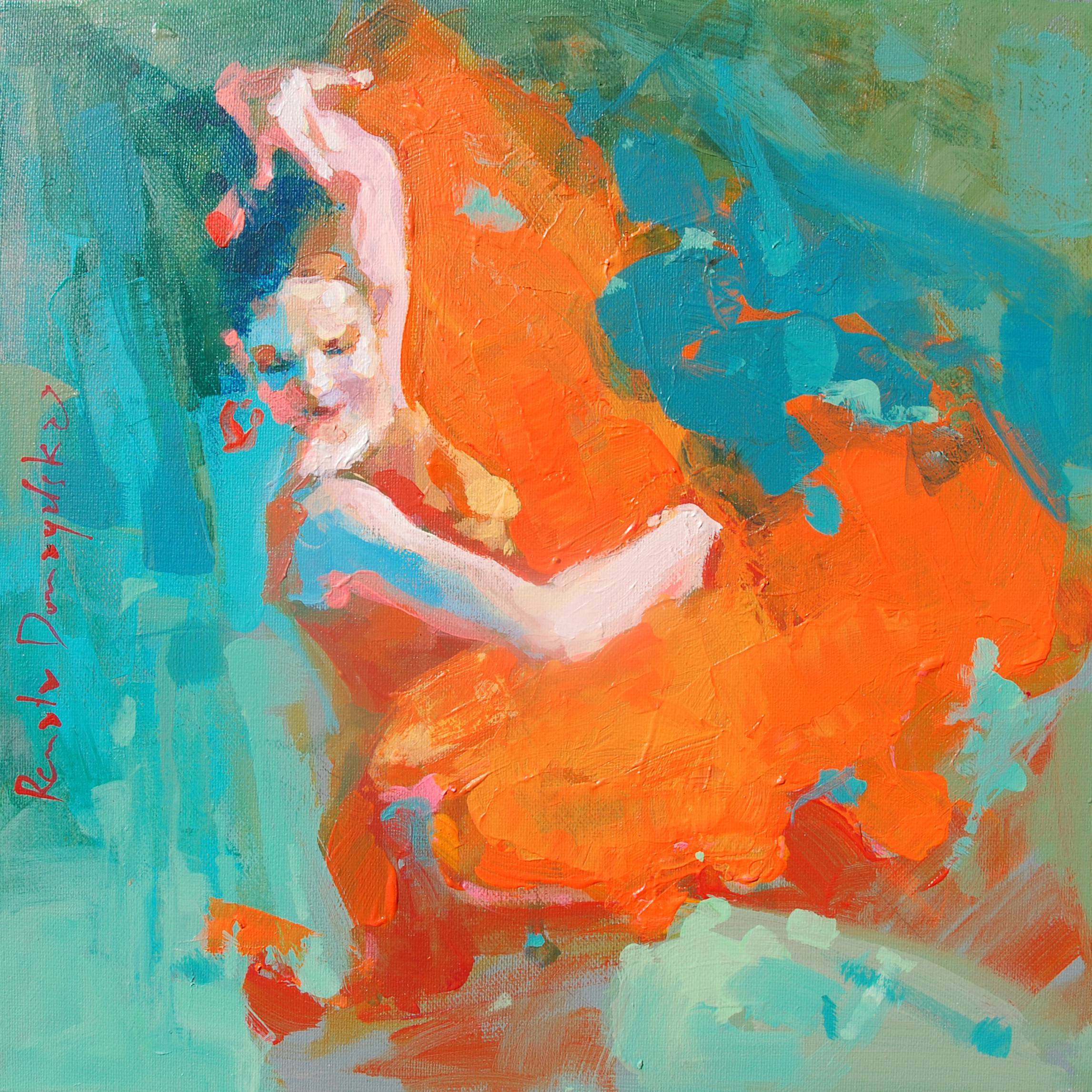 Cykl Tańce Świata w malarstwie. Tytuł - DRZEWKA POMARAŃCZOWE I MORZE.. (nr. 19/2013). Autor - Renata Domagalska. Rok powstania obrazu 2013. Technika - akryl na płótnie. Format 30x30 cm.
