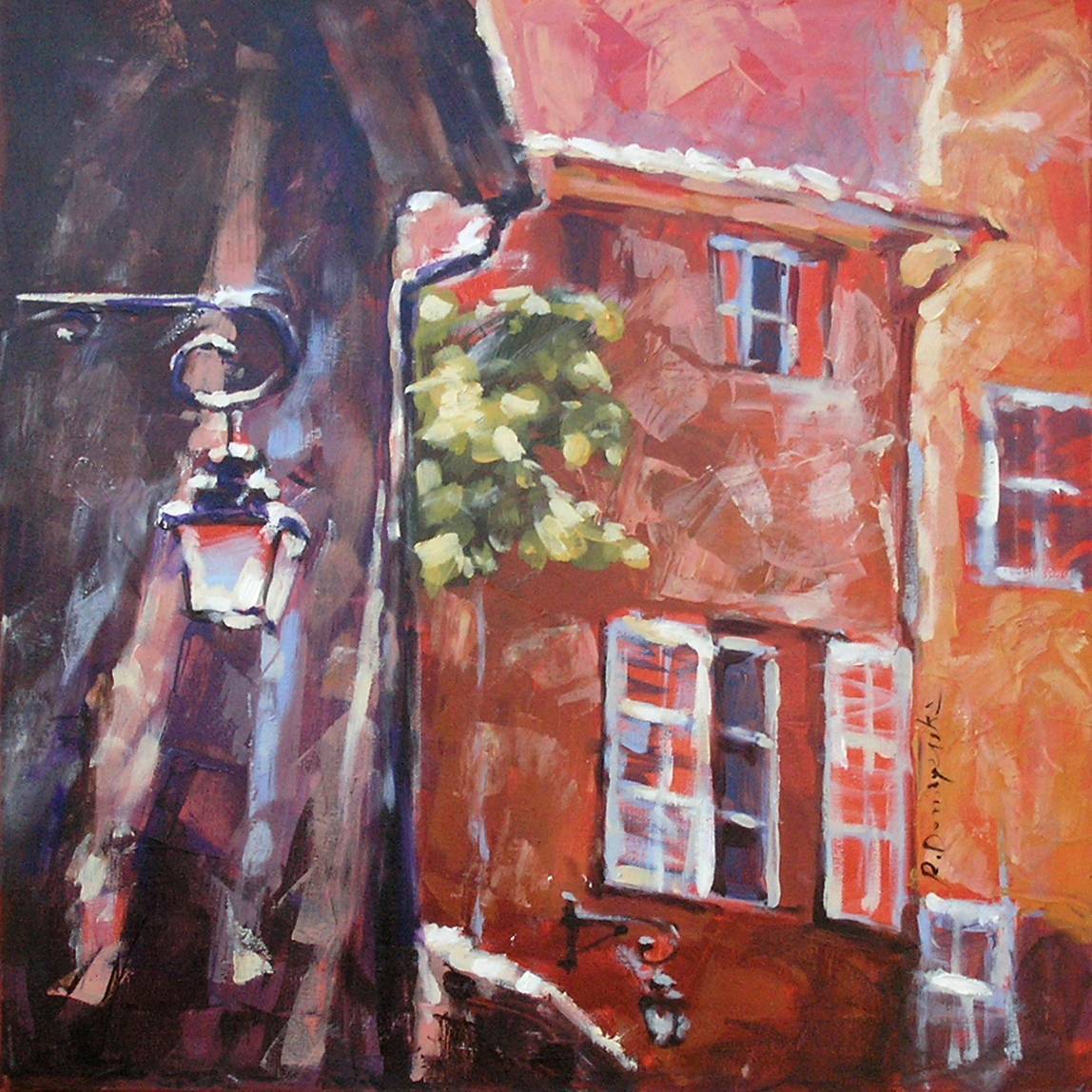 Na obrazie widzimy fragment urokliwej uliczki, skąpanej w ciepłych odcieniach czerwieni i pomarańczy. Budynki, pokryte grubymi pociągnięciami pędzla, przyciągają wzrok swoją teksturą i dynamiką. Okna, niewielkie i niebiesko-białe, zdają się szeptać historię tego miejsca. Lampa uliczna, z którą pewnie dzieci bawiły się w chowanego, oświetla ciemniejszy fragment obrazu. Kompozycja jest swobodna, niemal jakby artysta odkrywał zakamarki światłem. Atmosfera jest nostalgiczną podróżą do miejsca pełen wspomnień. Czuje się tu spokój późnego popołudnia, gdzie czas zwalnia, a wszystko jest „chill.” Styl obrazu przypomina impresjonizm, choć momentami wydaje się mieć własną, niepowtarzalną ścieżkę. Nałożenie farb, momentami chaotyczne, kreuje uczucie ulotności chwili. Obraz wywołuje u widza emocje pełne zadumy i refleksji. Myśli o wakacyjnych spacerach po nieznanych miastach. Myśli jak dziecko, że chciałbym tam biegać! Każdy detal wydaje się osobistym wspomnieniem artysty, a te wspomnienia odbijają się w oczach patrzącego. Może to być zachęta do odnalezienia w sobie małych, ciepłych momentów codzienności.