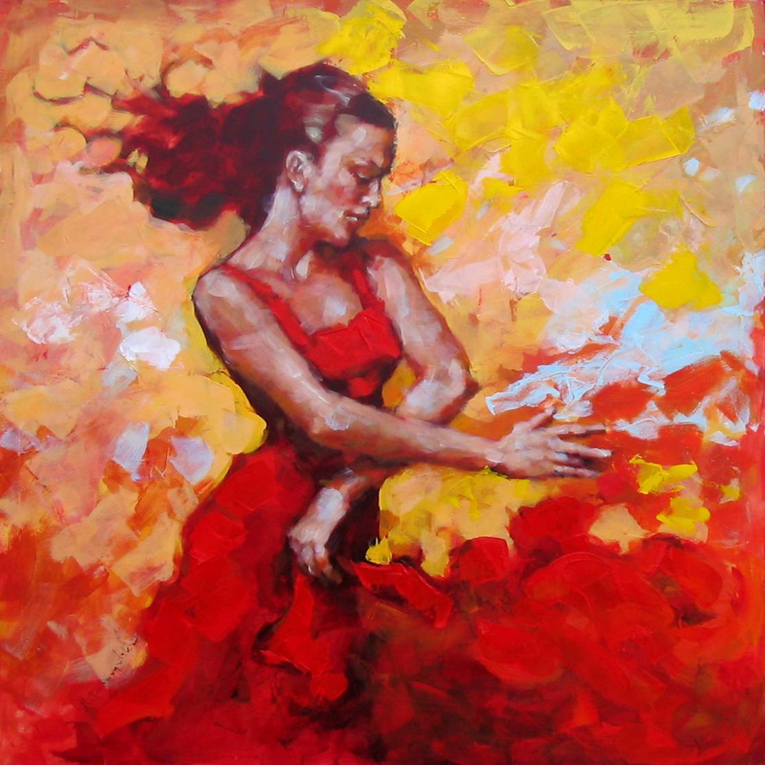 Obraz emanuje energią i ruchem, eksplodując żywymi kolorami czerwieni, żółci i pomarańczy. W centrum kompozycji znajduje się postać kobiety w czerwonej sukni, której dynamiczna poza oraz zamglone kontury sprawiają, że wydaje się niemal tańczyć na płótnie. Kolory tła, przypominające płomienie, harmonizują z jej strojem, dodając dziełu intensywności. Jest coś magicznego w tej scenie, coś co sprawia, że widz nie może oderwać oczu. To prawie jak flamenco, które zaprasza do wspólnego tańca. Atmosfera obrazu jest pełna pasji i żywiołu. Poprzez luźne, niemal abstrakcyjne pociągnięcia pędzla, artysta osiągnął efekt niekontrolowanej spontaniczności. Styl malarski przypomina impresjonizm z domieszką ekspresjonizmu, gdzie emocje są równie ważne jak forma. Obraz wywołuje całą gamę emocji. Od fascynacji i radości, po tęsknotę za wolnością. Może ty też poczujesz, jak serce bije szybciej, patrząc na tę niezależność i energię. Dla mnie to "masterpiece", prawdziwe dzieło sztuki. A moja siostra mówi, że to wygląda jak taniec ognia. Takie zestawienie kolorów i form to istny kalejdoskop emocji, każda wizyta przy tym obrazie odkrywa nowe detale i ślady inspiracji.