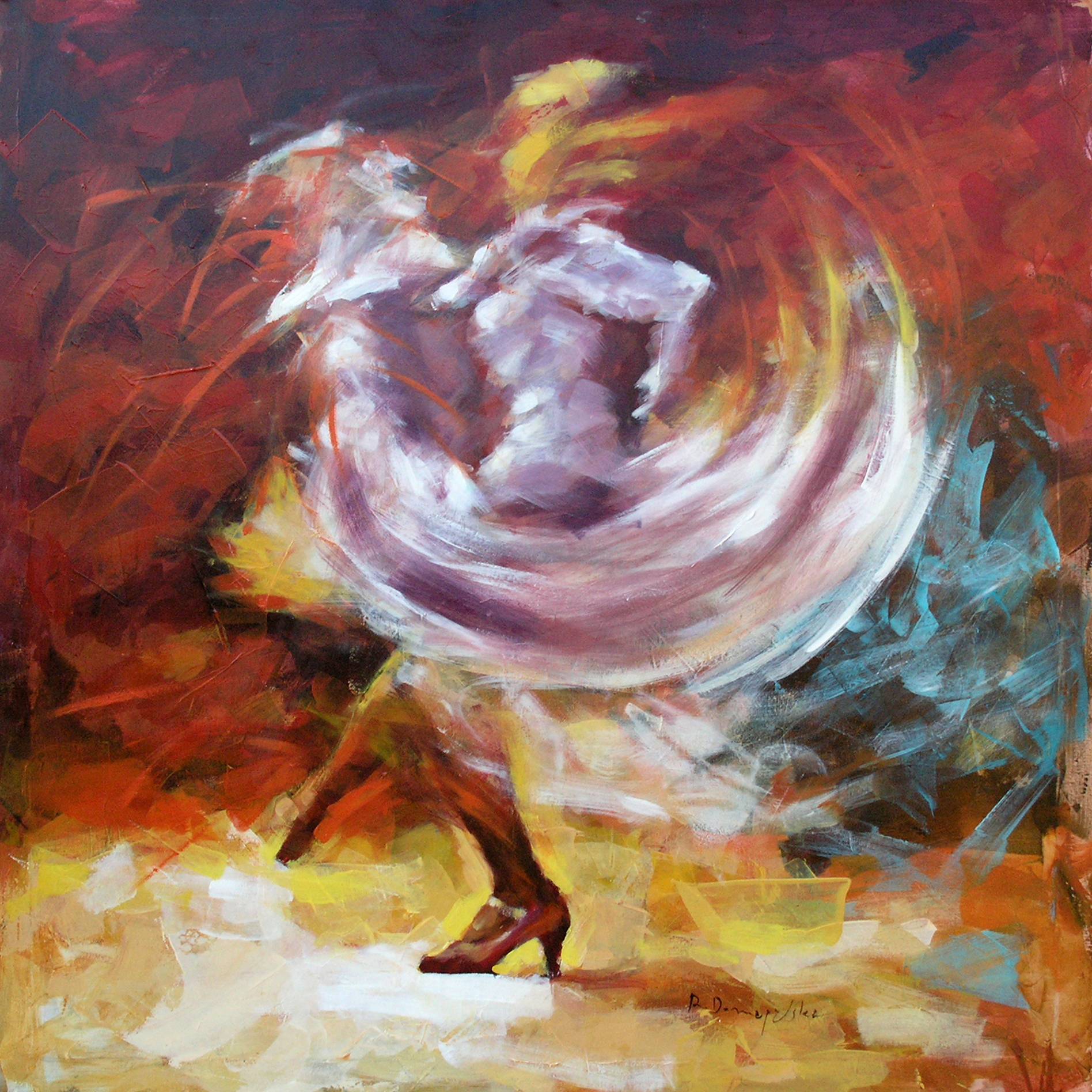 Na obrazie widzimy parę tańczącą w wirującym ruchu, a dominujące kolory to odcienie ciepłego brązu, pomarańczu i złota. Kształty są zamazane, co dodaje dynamiki, a kompozycja skupia się na centralnej części, gdzie para zdaje się unosić w tańcu. Atmosfera obrazu jest pełna energii i pasji. Można prawie poczuć rytm muzyki bijący z płótna. Styl jest impresjonistyczny, z wyraźnymi pociągnięciami pędzla, które oddają ulotność chwili. Ta nieskrępowana technika, pełna ekspresji, może wywołać różne emocje u odbiorcy - od radości i ekscytacji po zadumę nad chwilowym pięknem. Kiedy patrzę na ten obraz, czuję się jakbym był częścią festiwalu ruchu. Nawet można by powiedzieć, że artysta stworzył whirlwind pełen kolorów i emocji. Dla mnie to jak patrzenie na magiczny moment zaklęty w czasie. "Czy oni się nie zmęczą?" - zastanowiłoby się dziecko, widząc tę scenę. Ten obraz jest jak zatrzymana sekunda, pełna życia i energii, przypominająca o tym, jak ulotne mogą być chwile szczęścia.