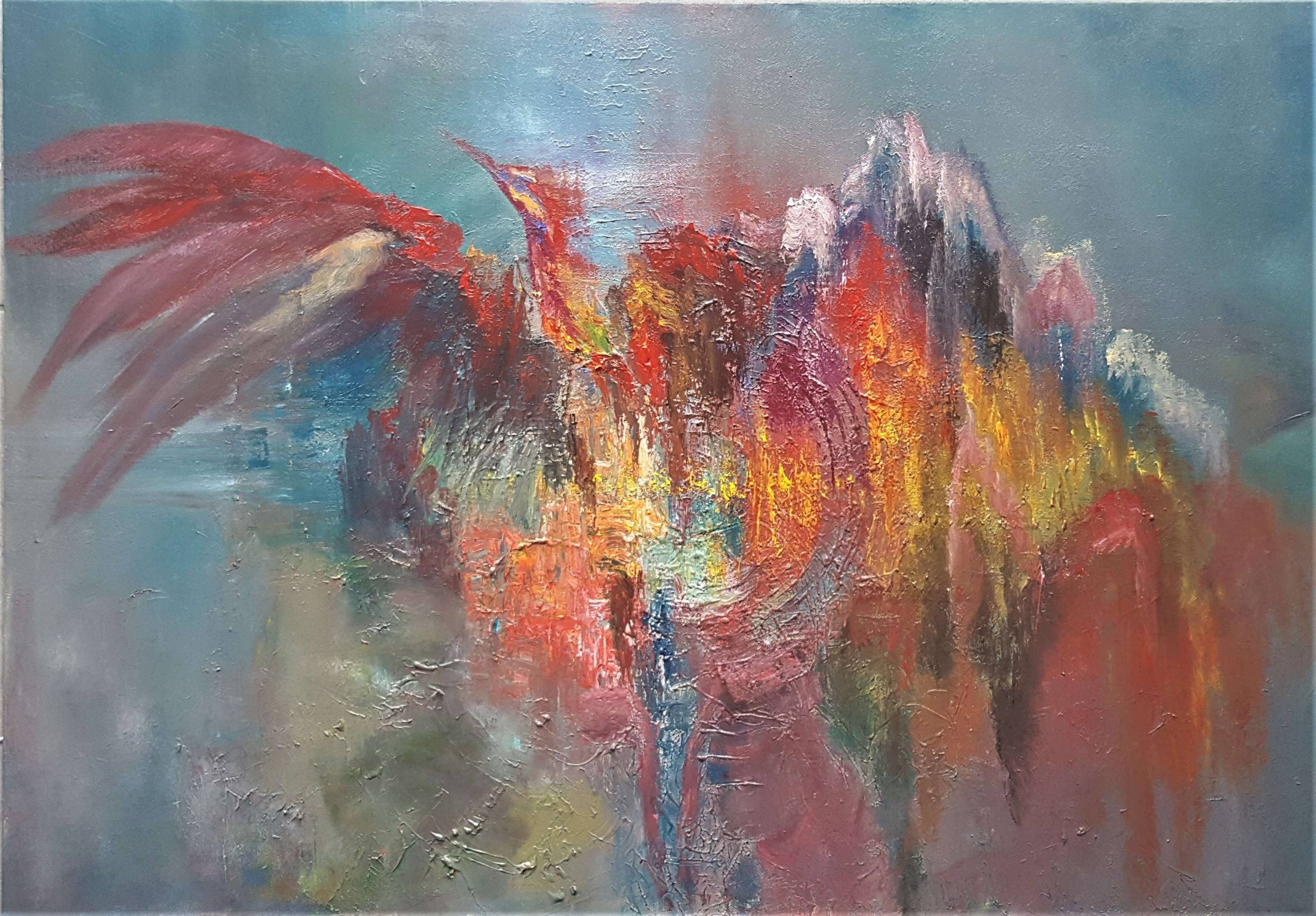 Obraz emanuje żywymi kolorami - dominują czerwienie, żółcie i głęboki niebieski. Na pierwszy rzut oka widzimy dynamiczne pociągnięcia pędzlem, które tworzą formę przypominającą feniksa unoszącego się w powietrzu. Kompozycja jest chaotyczna, ale w tej nieporządku tkwi harmonia, jakby artysta próbował uchwycić moment ulotny i magiczny. Atmosfera dzieła jest pełna energii, elektryzująca, jakby płomienie i iskry ożyły na płótnie. Styl obrazu jest ekspresjonistyczny, z ostrą fakturą i śmiałymi kolorami, używano tu technik impasto, co nadaje dziełu fizycznej obecności i głębokości. Obraz może wywoływać emocje podziwu, inspiracji, a może nawet i przemyśleń o odrodzeniu i sile ducha. Patrząc na ten obraz, czuję się zainspirowany - jest jak krzyk emocji schwytany na płótnie. Wow! Wygląda jak wielka chaotyczna eksplozja kolorów, co robi wrażenie nawet na 7-latku, który powiedziałby "to wygląda jak ognisty ptak!" Czasem takie dzieło może sprawić, że czujemy się "alive", przypominając nam, że sztuka jest w stanie uchwycić coś naprawdę niesamowitego.