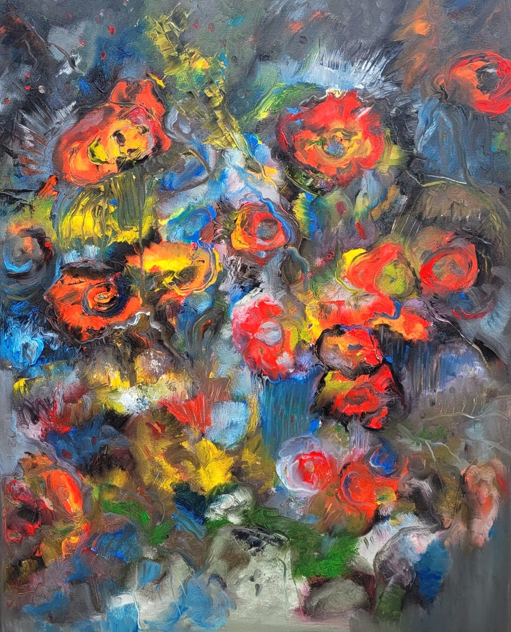 Obraz, który widzimy, to prawdziwy festiwal kolorów. Dominują soczyste czerwienie, kontrastujące z odcieniami niebieskiego i żółtego, które wirują w dynamicznej kompozycji. Kwiaty zdają się tańczyć na płótnie, niemal wypływając poza jego ramy. Tło jest ciemniejsze, co nadaje całości pewnej tajemniczości, jakby była to scena snu lub magicznej opowieści. Atmosfera tego dzieła jest żywa i pełna pasji. Czujesz się, jakbyś znalazł się w magicznym ogrodzie po zmroku. Styl przypomina impresjonizm z nutą ekspresjonistycznego chaosu. Artysta użył mocnych, dynamicznych pociągnięć pędzla, co nadaje obrazowi energię i ruch. Można wręcz poczuć, jak farba pulsuje pod powierzchnią. Ten obraz wzbudza emocje radości i zachwytu, ale może też wywoływać refleksję nad kruchością piękna. Choć kompozycja jest chaotyczna, każdy element wydaje się być na swoim miejscu, tworząc harmoniczną całość. Jak powiedziałby maluch: "To wygląda jak wielki, kolorowy bukiet tańczący na wietrze!". Wpatrując się dłużej, można poczuć ciepło lata i zapach ogrodu. Aż chce się usiąść i napawać tą feast for the eyes, delektując się chwilą. Patrząc na to dzieło, czujesz, że jesteś częścią czegoś większego, jakby tym kwiatom towarzyszył taniec myśli.
