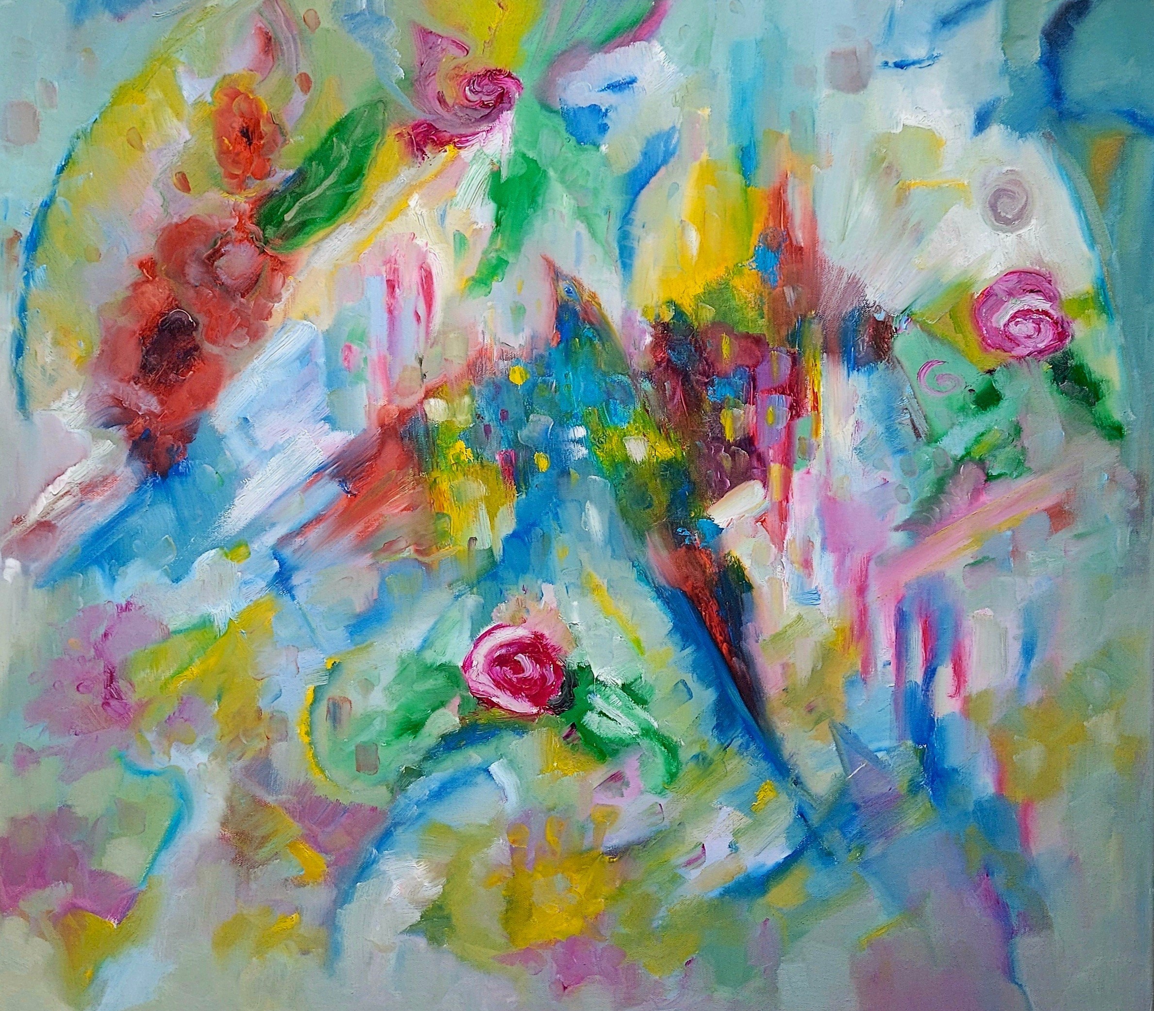 Obraz emanuje eksplozją kolorów, mieszanką pasteli i żywych barw. Dominują czerwienie, róże, zielenie i błękity, które tworzą chaotyczną, ale fascynującą kompozycję. Kształty są tu rozmyte i płynne, jakby żyły własnym życiem, splatając się w surrealistyczny taniec. Patrząc na tę abstrakcję, odczuwamy spokój, a jednocześnie ekscytację. Artysta zastosował techniki impasatu, nadając obrazowi strukturalną głębię. Pociągnięcia pędzla są dynamiczne, co dodaje wrażenia ruchu i energii. Obraz przypomina mi senne marzenia, gdzie wszystko jest możliwe. Emocje, jakie wywołuje ta praca, są niczym rollercoaster - można poczuć radość, ale i melancholię. "It's like magic," powiedziało by dziecko patrząc na to kolorowe dzieło. Obraz wręcz zaprasza do refleksji nad naszymi wewnętrznymi przeżyciami. Jest w nim pewna naiwność, ale także głęboka symbolika, która angażuje umysł i serce. Patrzę na to i czuję, że wszystko jest na swoim miejscu, choć nie powinno być. Każdy element wydaje się częścią większej opowieści.