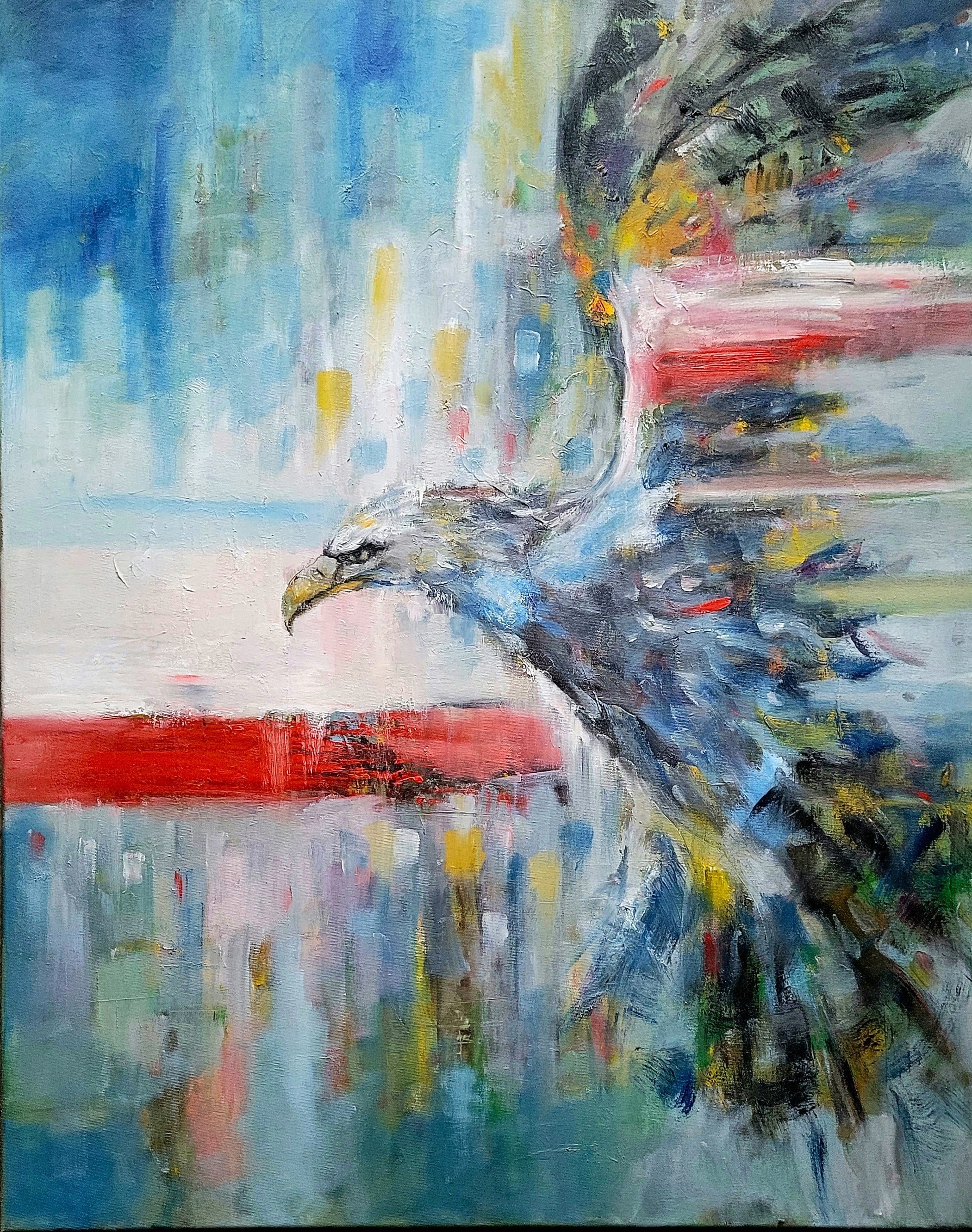 Na obrazie widać potężnego orła w locie. Barwy to intensywne błękity, szarości i mocne czerwienie, które budują dynamiczny kontrast. W tle widoczny jest zarys lekko rozmytej flagi, co sugeruje prędkość i ruch. Kompozycja jest pionowa, co dodaje uczucia wzniosłości i lekkości. Obraz emanuje energią i wolnością, a także powiewem czegoś niezwykłego. Artysta posługuje się techniką impastu, co nadaje teksturę i głębię, a pociągnięcia pędzla są swobodne, niemal chaotyczne. Styl jest nieco abstrakcyjny, ale silnie sugestywny, tworząc w widzu uczucie podziwu i zachwytu nad majestatyczym lotem ptaka. Wow, ten orzeł wygląda jak superbohater! Obraz może kojarzyć się z poczuciem wolności czy siły, za każdym razem oczarowując widza na nowo. To dzieło sztuki mówi do nas: "freedom". Każde spojrzenie odkrywa nowe szczegóły, co sprawia, że jest niezwykle angażujące. Personalnie czuję, jakby ten orzeł miał mnie zabrać w podróż pełną przygód.