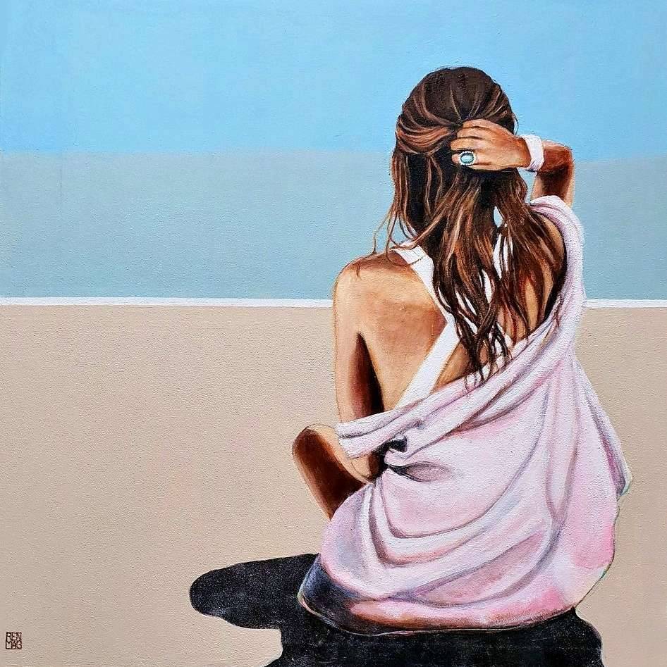 Obraz na płótnie z cyklu: "Spotkania na plaży", format: 90 cm x 90 cm, 2020 r.; Boczne krawędzie płótna są zamalowane w tonacji obrazu.