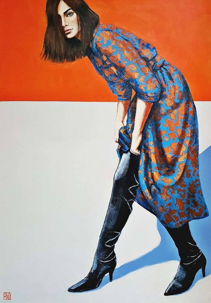 Na obrazie widzimy postać kobiety w dynamicznej pozie, przypominającej moment napięcia zanim coś się wydarzy. Kolory są żywe i kontrastujące; intensywna pomarańczowa ściana w tle kontrastuje z biało-szarym podłożem, na którym stoi postać. Sukienka w niebiesko-pomarańczowy wzór zdaje się falować przy każdym ruchu, a czarne kozaki podkreślają nowoczesny styl. Może wyglądać trochę jak superbohaterka. To myślisz? Obraz emanuje pewnym rodzajem napięcia i odważnej pewności siebie. Artysta zastosował wyraźne linie i mocne kolory, co nadaje pracy charakterystyczny styl pop-art z nutą ekspresjonizmu. Można by nawet powiedzieć 'bold', taki jest ten styl. Jest jakby mówil: Patrz na mnie! Obecność cienia pod stopami sugeruje światło z góry, podkreślając trójwymiarowość postaci. Wzór na sukience, przypominający motywy roślinne, nadaje całości dynamiczny, niemal hipnotyczny wymiar. Patrząc na ten obraz, czuję pewien rodzaj niepokoju i ekscytacji. Co się stanie? Jakie jest następne posunięcie tej tajemniczej postaci? A może to tylko chwila zatrzymania w codziennym biegu? Sam fakt, że kobieta patrzy na widza, sugeruje, że chce nam coś powiedzieć. Jest w tym coś intrygującego, prawda?