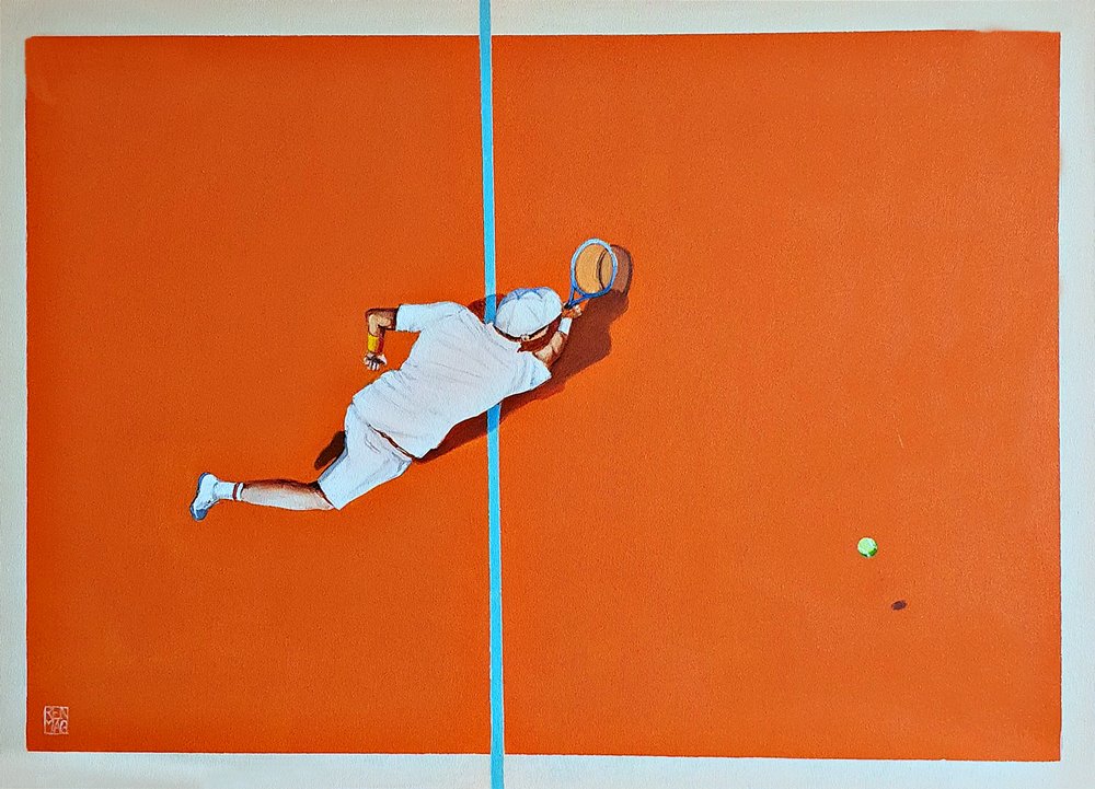 Na tym dynamicznym obrazie dominuje intensywny, pomarańczowy kolor kortu, który wypełnia prawie całą przestrzeń dzieła. Po środku widzimy sylwetkę tenisisty w białym stroju, zawieszonego w powietrzu w chwili pełnej napięcia. Jego sylwetka jest uchwycona w ruchu, jakby czas na chwilę zatrzymał się, co dodaje obrazowi niesamowitej energii. Cienka, niebieska linia dzieli kompozycję na dwie części, tworząc wrażenie minimalizmu, a jednocześnie podkreślając intensywność akcji. Obraz emanuje atmosferą skupienia i pasji, wywołując w widzu emocje przypominające adrenalinę towarzyszącą sportowej rywalizacji. Styl artystyczny charakteryzuje się prostotą i wyrazistością form, co pozwala nieco surrealistycznie podejść do przedstawianej sceny. Technika płaskiej plamy barwnej wprowadza harmonię, a jednocześnie pozwala skoncentrować się na detalach postaci. Dzieło może wywoływać różne interpretacje — od podziwu dla chwili sportowego wysiłku po refleksje na temat ulotności czasu. Patrzę na ten obraz i czuję się, jakbym sam zaraz miał wskoczyć na ten boisko. Aż chce się krzyknąć: "Go, go, win it!" Efekt zatrzymania czasu dodaje obrazowi pewnego "wow" efektu, który przyciąga uwagę. Emocjonalne napięcie, które wręcz unosi się nad obrazem, wydaje się być niemal namacalne. Obraz przypomina mi letnie dni spędzone na grze w tenisa z przyjaciółmi, kiedy to każda chwila była pełna energii i zabawy.