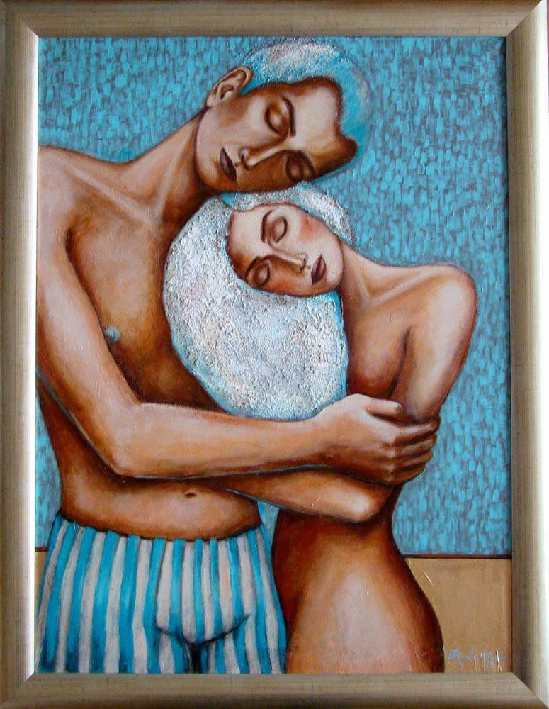 Obraz wykonany techniką mieszaną akryl + elementy złoceń .Zabezpieczony werniksem .Sygnowany . Oprawiony w drewnianą ramę o szerokości 6 cm