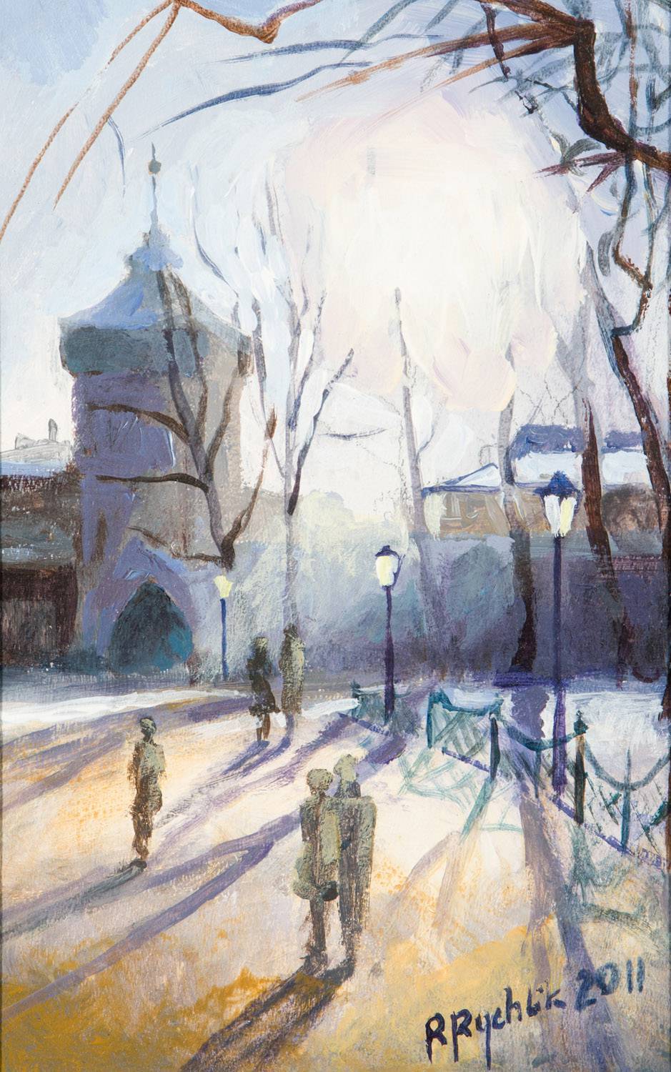 Na obrazie dominuje spokojna paleta chłodnych barw. Niebieskości mieszają się z odcieniami bieli, tworząc zimowy pejzaż. Centralnym elementem kompozycji jest wieża, która wyłania się spośród drzew. Kształty są delikatne, miękkie, a linie pociągnięcia pędzla dodają całej scenie dynamicznego wyrazu. Scena wygląda, jakby była otulona mgłą, co dodaje jej tajemniczości. Oświetlone lampy rzucają długie cienie na śnieg, co tworzy intrygujący kontrast między światłem a cieniem. Atmosfera obrazu jest niezwykle nostalgic. Czujemy spokój, jakby czas na chwilę się zatrzymał. Styl artysty ujawnia subtelny impresjonizm. Pociągnięcia pędzla są wyraźnie widoczne, ale miękkie, co nadaje dziełu lekkiego, niemal eterycznego charakteru. To jakby podróż w przeszłość, zatrzymana w czasie. Podejście bardzo malarskie, gdzie każde przesunięcie pędzla wydaje się przemyślane i czułe. Obraz może wywoływać różne emocje u odbiorcy. Może być odczytany jako opowieść o zimowym spacerze, o codziennym życiu w mroźnym mieście. Możliwe, że malarzowi chodziło o ukazanie codzienności w magicznym świetle. A może to tylko gra światła i cienia? Jak mawia małe dziecko: „to wygląda jak bajka”. Myślę, że obrazy takie przyciągają wzrok subtelnymi detalami. To takie magiczne, że człowiek chce tam być, wdychać zimne, rześkie powietrze i słuchać dźwięku kroków na śniegu. Wow, to naprawdę evocative.