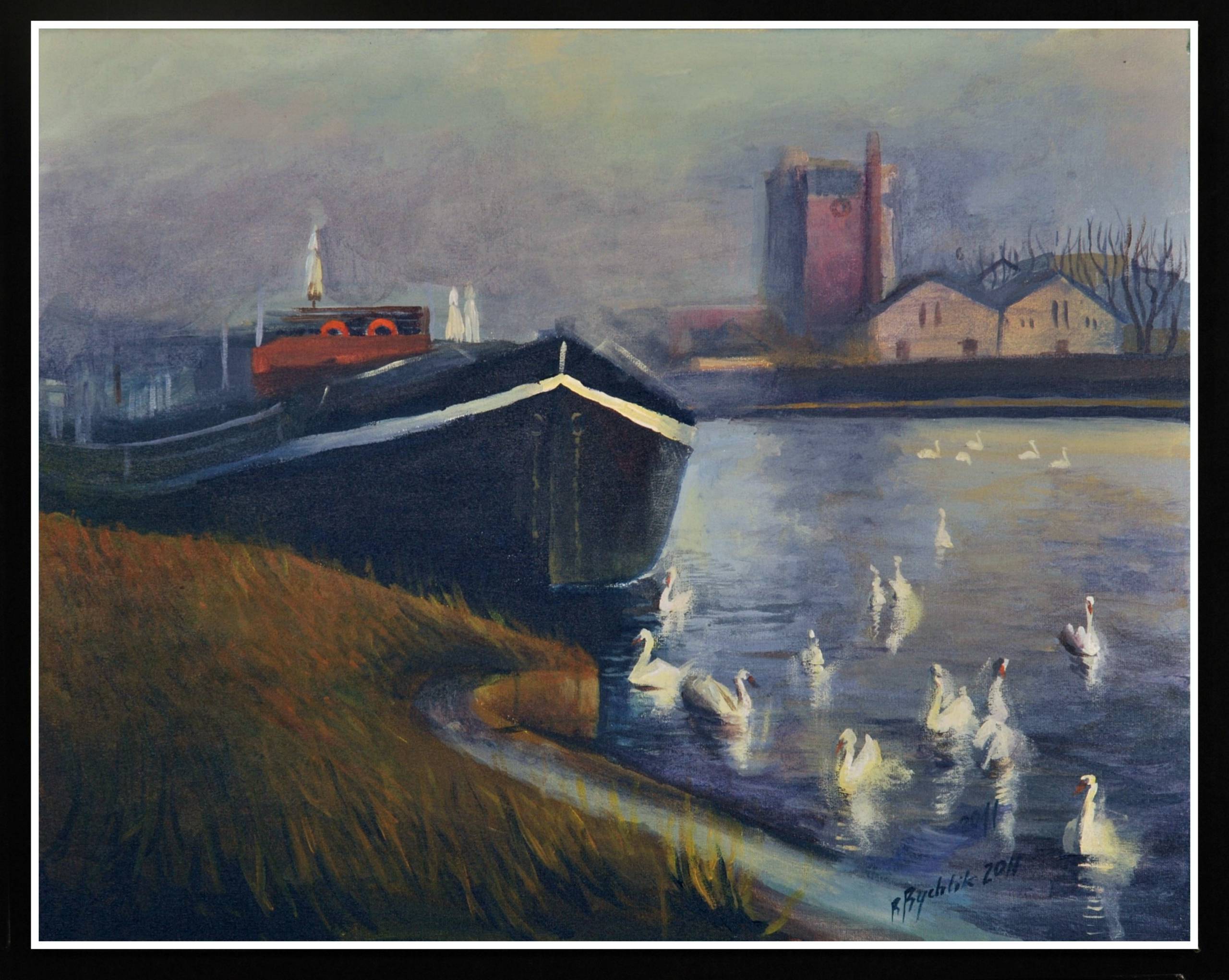 Obraz przedstawia spokojny krajobraz nad wodą. Dominują stonowane kolory, czerwienie, błękity i szarości, tworząc spokojną atmosferę późnego popołudnia. Centralnym punktem jest duża, ciemna łódź zakotwiczona przy brzegu, która wprowadza pewne napięcie do kompozycji. W tle widać tajemnicze budynki, a widok dopełniają białe łabędzie pływające po lekko zafalowanej wodzie. To trochę jak sen, w którym wszystko jest możliwe, a świat, mimo że znajomy, wydaje się nieco inny. Artysta użył miękkich pociągnięć pędzla, które dodają lekkości i delikatności całej scenie. Chwilami mógłbym przysiąc, że czuję zapach wilgotnej ziemi i słyszę cichy szum wody. Użycie światła i cienia jest tu naprawdę przemyślane i dodaje dziełu niecodziennego wymiaru. To sprawia, że odbiorca może poczuć się jakby naprawdę był w tym miejscu - calm. Dzieci powiedzłyby, że to miejsce gdzie łabądki bawią się w berka. Patrząc na obraz, można poczuć nostalgię i tęsknotę za chwilami spędzonymi na łonie natury. Aż chce się zatrzymać, zastanowić, poczuć... zaopiekować się tym momentem ciszy. Obraz zachęca do refleksji, do zatrzymania się na chwilę i podziwiania piękna codzienności.