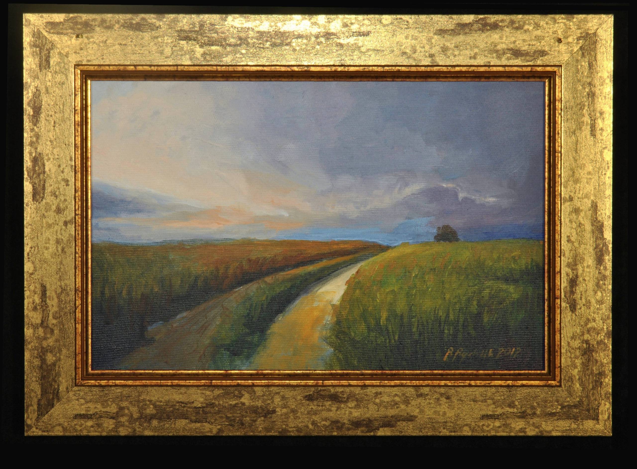 Na obrazie widzimy rozległy krajobraz, który hipnotyzuje spokojem. Kolory są stonowane, a artysta wykorzystał paletę ziemistych brązów do przedstawienia pól, które ciągną się po horyzont. Droga wijąca się przez środek obrazu dodaje poczucia ruchu i prowadzi wzrok ku dalekiej przestrzeni. Niebo jest dynamiczne, pełne miękkich chmur i pastelowych odcieni niebieskiego oraz pomarańczu. Wow, naprawdę chciałbym tam pobiegać! Kompozycja jest zrównoważona, a złota rama dodaje elegancji i ekskluzywności. Styl tego dzieła to połączenie realizmu z impresjonistycznym ujęciem światła, gdzie pociągnięcia pędzlem są delikatne, lecz zdecydowane. Obraz emanuje spokojem, ale też skłania do zadumy. Można by pomyśleć, że jest to zaproszenie do refleksji nad drogą życia, która czasami jest kręta, ale zawsze prowadzi dokądś. Jest coś deeply soothing w tej przestrzeni, co sprawia, że można się zatopić w marzeniach. Można poczuć powiew wiatru na policzkach. Naprawdę, dzieło to budzi w odbiorcy wewnętrzny spokój i refleksję.