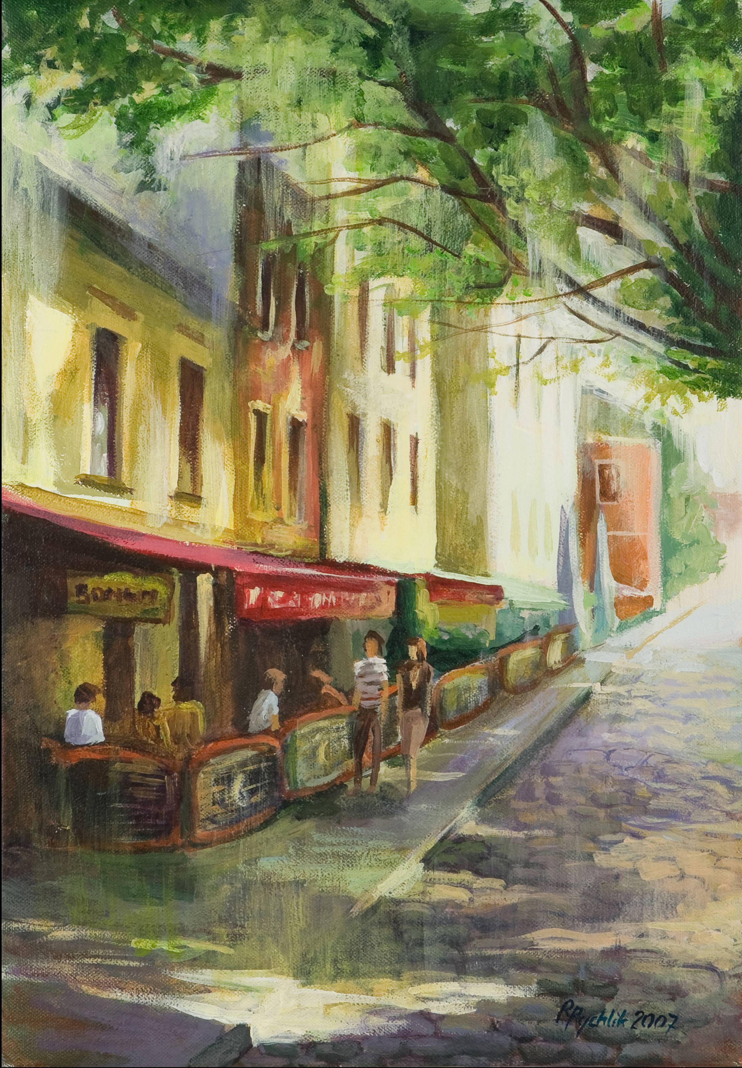 Na obrazie dominuje ciepła paleta kolorów, z przewagą zieleni, żółci i brązów, które tworzą harmonijną kompozycję. Spojrzenie na uliczkę, gdzie słońce subtelnie przebija się przez liście drzew, przywołuje na myśl leniwe popołudnia w starym europejskim mieście. Kształty są delikatne i niedopowiedziane, co nadaje obrazowi lekkości. Atmosfera jest spokojna, niemal sielska, skłaniająca do zaszycia się w kawiarnianym kąciku z filiżanką kawy w ręku. Styl artystyczny zdaje się być impresjonistyczny, z wyraźnymi pociągnięciami pędzla, które tworzą wrażenie ruchu i światła. Obraz może wywoływać u oglądającego nostalgiczną tęsknotę za beztroskimi chwilami. Technika artysty łączy precyzję z lekkością, co daje poczucie uchwycenia ulotnej chwili. Dzieci mogą pomyśleć: "Też bym chciał zjeść lody w takiej kawiarence!". Wiatr delikatnie kołyszący liście dodaje obrazu dynamizmu i czyni go bardziej alive. To dzieło sugeruje, że życie toczy się powoli, nadaje chwili sens i zachęca do refleksji nad codziennym pięknem.