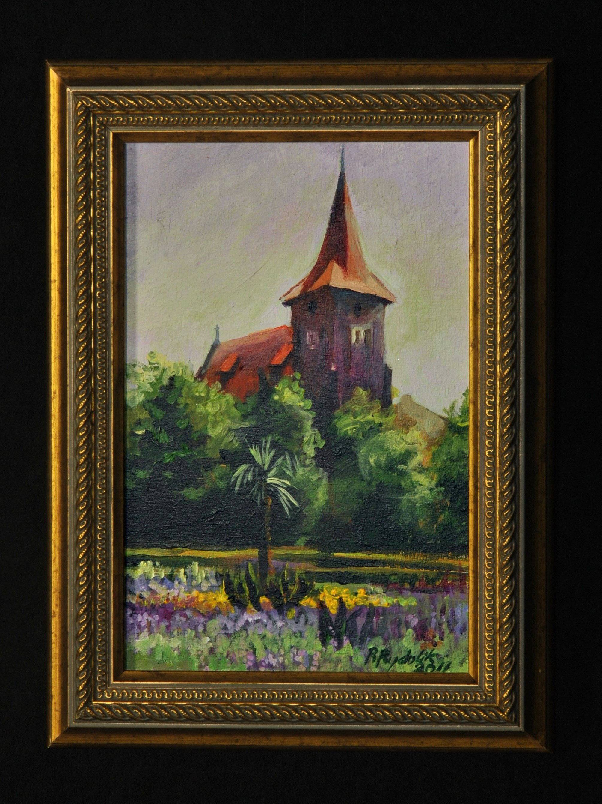 Ten obraz przedstawia malowniczy kościół z czerwonym dachem, dumnie wznoszący się ponad morzem zieleni. Kolory są spokojne, z dominacją soczystych tonów zieleni i ciepłej czerwieni. Fioletowe i żółte kwiaty na pierwszym planie dodają obrazu żywiołowości i energii. Kompozycja jest harmonijna, z wyrazistym kontrastem między spokojem krajobrazu a dynamicznym wrażeniem kwitnących roślin. Patrząc na ten obraz, można poczuć spokój wiejskiego popołudnia. Życie płynie spokojnie, a my, jakby mimochodem, stajemy się częścią tego idyllicznego pejzażu. Styl artysty jest dość impresjonistyczny, z miękkimi pociągnięciami pędzla, które przypominają o płynności chwytanej chwili. Technika ta sprawia, że obraz jest jak migawka wspomnień, które ożywają na płótnie. Wow, tak jakby kościół chciał coś opowiedzieć. Co? Może historię minionych pokoleń lub sekrety skrywane przez lata. Obraz przyciąga wzrok bogactwem detali, a jednocześnie wywołuje w nas relaksacyjne westchnienie. To miejscówka, gdzie czas płynie wolniej, a życie nabiera smaków i kolorów. Personal reflection? Aż chce się tam podjechać, usiąść w ogrodzie i pomedytować o życiu. Ale fajnie by było mieć taki magiczny ogród tuż za oknem. Niezależnie od nastroju, ten obraz przyciąga jak ciepłe promienie słońca w chłodny dzień.