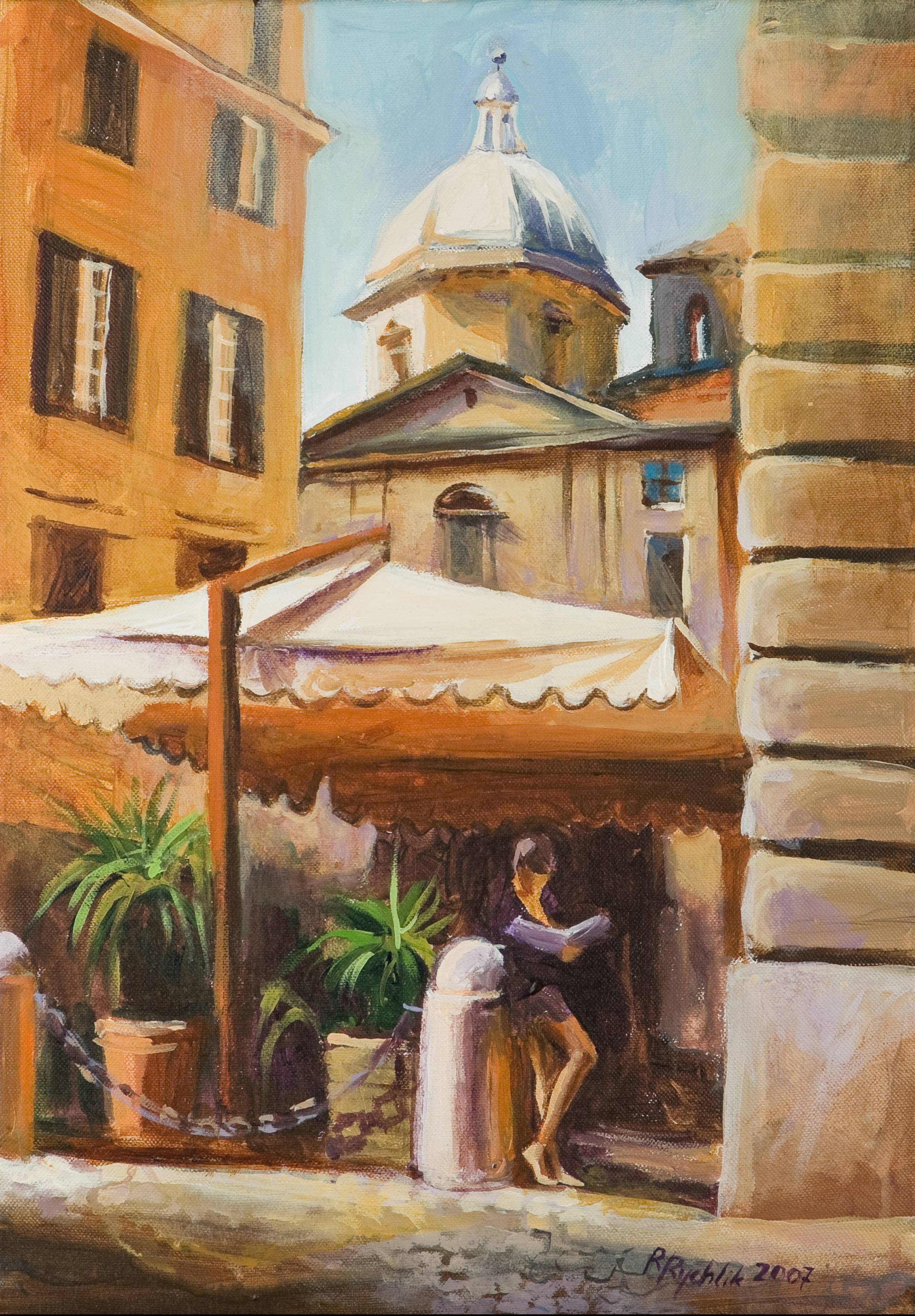 Na obrazie widać urokliwy zakątek miejskiego placu, zanurzonego w blasku ciepłego słońca. Kolory są pełne życia: dominująca ochra budynków przypomina o późnym popołudniu, a błękitne niebo kontrastuje z pastelową kopułą w tle. Kompozycja jest dynamiczna, z budowlą po lewej i prawą stroną kadru, prowadząc wzrok do centralnej postaci. Przytulny nastrój emanuje z tego dzieła, jakby miało własny heartbeat, zachęcając do chwili relaksu i zadumy. Artysta zastosował technikę impastu, gdzie grube pociągnięcia pędzla dodają tekstury i głębię. Cienie i światło zostały oddane w sposób mistrzowski, tworząc trójwymiarową iluzję i ożywiając scenę. Obraz może wywołać w nas refleksję o codziennym życiu i prostych przyjemnościach, które często umykają w wirze dnia codziennego. Czy ktoś zauważył ten mały detal? To dziecko przy stole, czyta z zaciekawieniem. Obraz pełen jest atmosfery, która sprawia, że pragnie się tam przenieść, usiąść z kubkiem kawy i po prostu poczuć tą unikalną "calm". Ba, patrząc na ten obraz, mogę niemal poczuć zapach cytrusów i ciepły powiew wiatru.