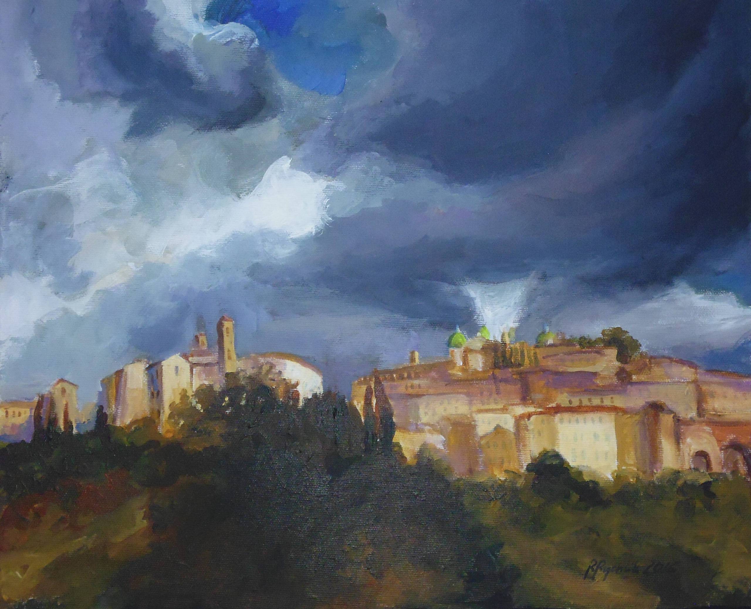 Obraz prezentuje malowniczy krajobraz, gdzie centrum stanowią stare budowle na wzgórzu, otoczone bujną zielenią. Dominują w nim nasycone odcienie błękitu i szarości nieba, które sprawiają wrażenie nawałnicy zawieszonej nad miastem. Słońce delikatnie oświetla architekturę, której ciepłe kolory tworzą kontrast z zimnym tłem. Chmury, wyglądające niczym wirujące pędzlem pociągnięcia, dodają dynamiki i dramatyzmu. To jakby "storm is coming". Atmosfera jest pełna napięcia. Można poczuć, jakby natura miała się zaraz rozszaleć, a mimo to, miasto wydaje się spokojne, niemalże obojętne. Wyraża dualizm między spokojem a burzą. Techniki malarskie sugerują impresjonistyczne podejście z ekspresyjnymi pociągnięciami pędzla i intensywnymi kolorami, które tworzą żywy i emocjonujący efekt artystyczny. Krótkie pociągnięcia i miękkie przejścia kolorów nadają obrazowi płynności, jakby myśli i emocje artysty zostały na nim utrwalone w spontaniczny sposób. Patrząc na ten obraz, można poczuć mieszankę podziwu i niepokoju. Taki obraz skłania do zadumy nad potęgą przyrody i kruchością ludzkich konstrukcji. Łatwo pozwolić myślom zabłądzić w przeszłość tego miejsc. Myślę, że siedmioletnie dziecko powiedziałoby: "To wygląda jak miasto w chmurach!". Obraz jest naprawdę captivating.