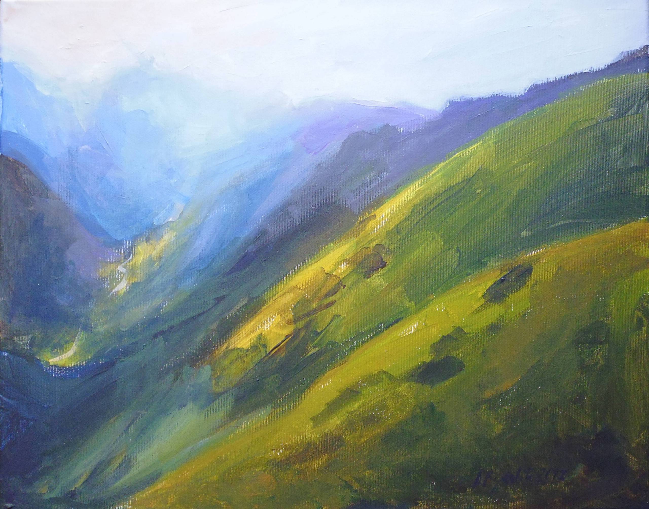 Obraz przedstawia zachwycający krajobraz górski, gdzie dominują żywe zielenie i błękity. Wydaje się, jakby artysta uchwycił moment, gdy słońce delikatnie oświetla zielone wzgórza, dodając złocistych refleksów. Kolory są intensywne, jednocześnie jednak nieagresywne. Chmury na niebie wyglądają jakby właśnie rozpuszczały się w błękicie, tworząc subtelny kontrast. Kompozycja jest dynamiczna i prowadzi wzrok wzdłuż łagodnych linii wzgórz. Pędzle zostały użyte z niezwykłą swobodą, co dodaje obrazowi świeżości. Można poczuć, jakby był to poranek pełen nadziei i oczekiwań. Wow! Atmosfera obrazu jest pełna spokoju i jednocześnie energii natury. Technika malarska jest luźna, z wyraźnie zarysowanymi pociągnięciami pędzla, co nadaje dziełu pewnej spontaniczności. Styl przypomina trochę impresjonizm, gdzie najważniejsze są światło i kolor. Dzieło wzbudza emocje tęsknoty za naturą, zachęca do refleksji nad pięknem świata. Może wywołać u odbiorcy poczucie odprężenia i harmonii, a nawet chęć wyruszenia w góry, by doświadczyć tego piękna osobiście. To taki rodzaj obrazu, który sprawia, że po prostu czujesz się dobrze. I want to be there! Pisząc te słowa, czuję, jakby ten krajobraz był blisko mnie, niemal na wyciągnięcie ręki.