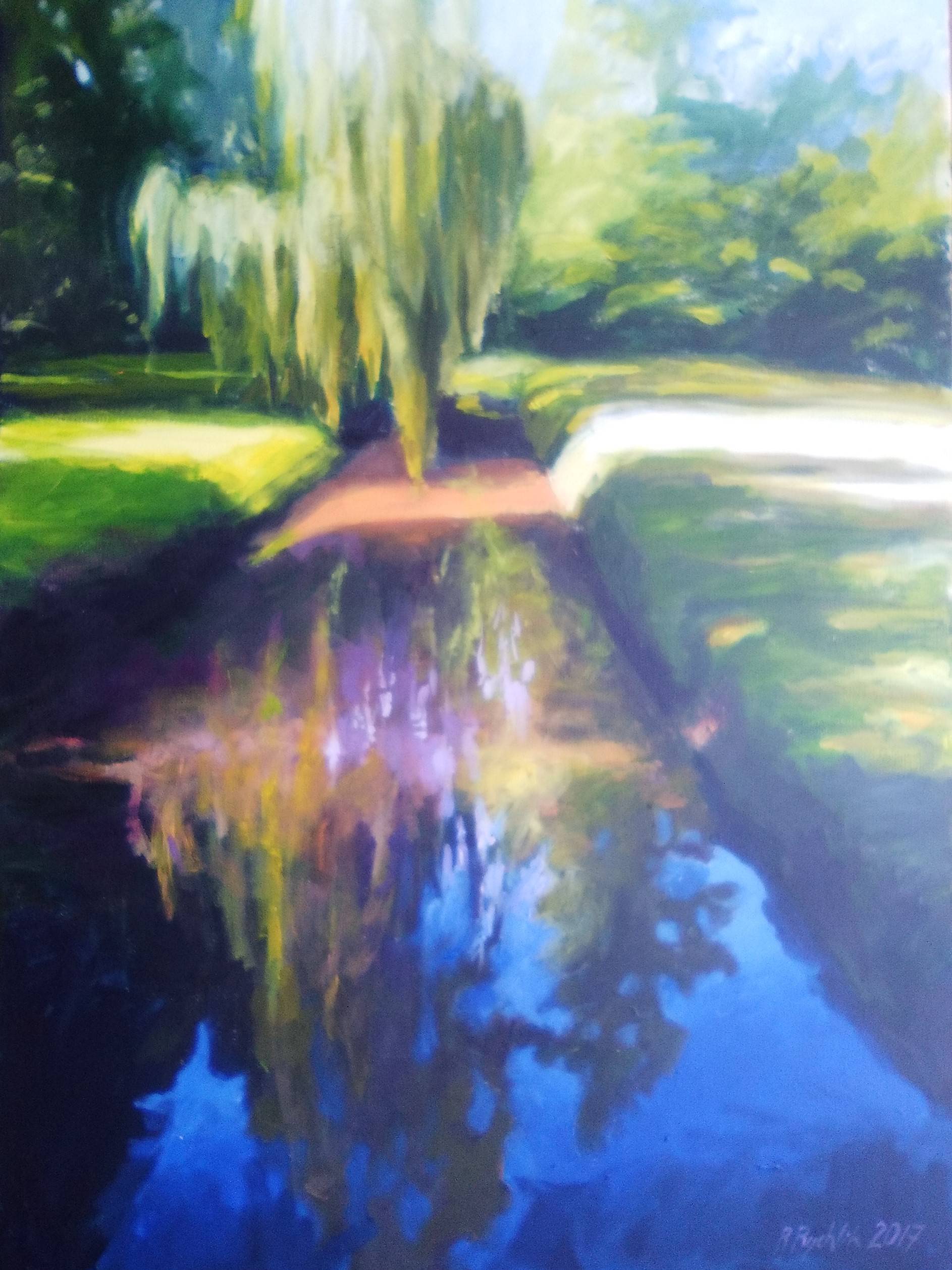 Obraz przedstawia malowniczy krajobraz, w którym dominują intensywne kolory - zielenie i błękity. Centralnym elementem jest wierzba płacząca, której delikatne gałęzie rzucają się w oczy i zdają się tańczyć na wietrze. W dole widać taflę wody, która odbija kolory nieba i roślinności, tworząc surrealistyczne wrażenie. Kompozycja jest dynamiczna, a jednocześnie harmonijna, przywodząc na myśl spokój letniego popołudnia. Atmosfera obrazu jest pełna ciszy i nostalgii, idealna do medytacji i chwil zadumy. Widz niemal czuje powiew wiatru i słyszy śpiew ptaków. To takie miejsce, gdzie chciałoby się zabrać kocyk i książkę, prawda? Artystyczny styl obrazu przypomina impresjonizm z jego miękkimi pociągnięciami pędzla i subtelnym światłocieniem. Technika użycia światła i cienia jest mistrzowska, a kolory zdają się pulsować życiem. Można odnieść wrażenie, że artysta uchwycił tu chwilę ulotnego piękna natury. Dla odbiorcy taki obraz to prawdziwy "relaxation point". Pozwala zatrzymać się na chwilę i zapomnieć o codziennych troskach. Ja bym tam poszedł! Dzieci mogłyby powiedzieć: "Patrz, tam jest magiczne jezioro!". To miejsce, które każdy chciałby odwiedzić, choćby w wyobraźni.