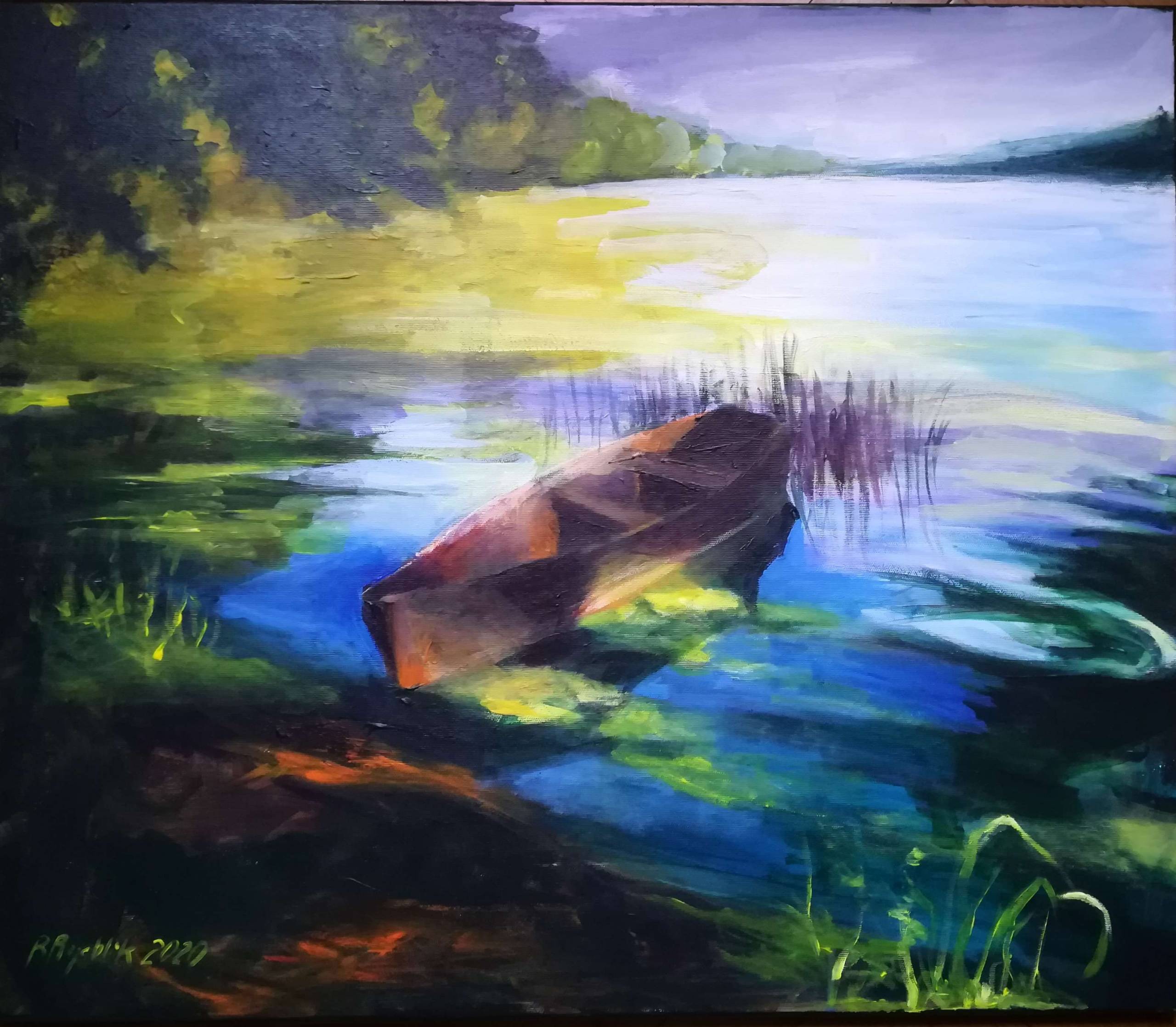 Na obrazie widzimy samotną łódź spoczywającą w tajemniczym jeziorze. Otaczają ją przygaszone odcienie zieleni przechodzące w ciepłe brązy i żółcie, które nadają kompozycji harmonię. A na wodzie wirujące refleksy koloru blue! działa na wyobraźnię. Całość zbudowana jest z dynamicznych pociągnięć pędzla, które nadają obrazowi płynność i głębię. Artysta sięgnął po techniki impastu - grube warstwy farby tworzą trójwymiarowe efekty. Łódź stojąca na cichej wodzie przywodzi na myśl spokój, a zarazem jakiś tajemniczy niepokój. Co czai się pod powierzchnią? Atmosfera obrazu jest melancholijna, ale nie przygnębiająca. Jest w niej nadzieja na nadejście dnia. Przyjemna cisza natury jest niemal namacalna. Patrząc na obraz, można poczuć powiew wiatru i usłyszeć delikatny plusk wody. Dla dziecka, które może mówić: "Ta łódka płynie do krainy czarów!", obraz staje się piękną przygodą. Bardziej dorosły widz być może zastanowi się nad samotnością i beztroskim czasem spędzonym nad wodą. A może odkryje w tej scenie ucieczkę od miejskiego zgiełku. Takie art never fades, zaprasza do przemyśleń i marzeń. To jest piękno sztuki, która nie jest tylko dla oka, ale i dla duszy.
