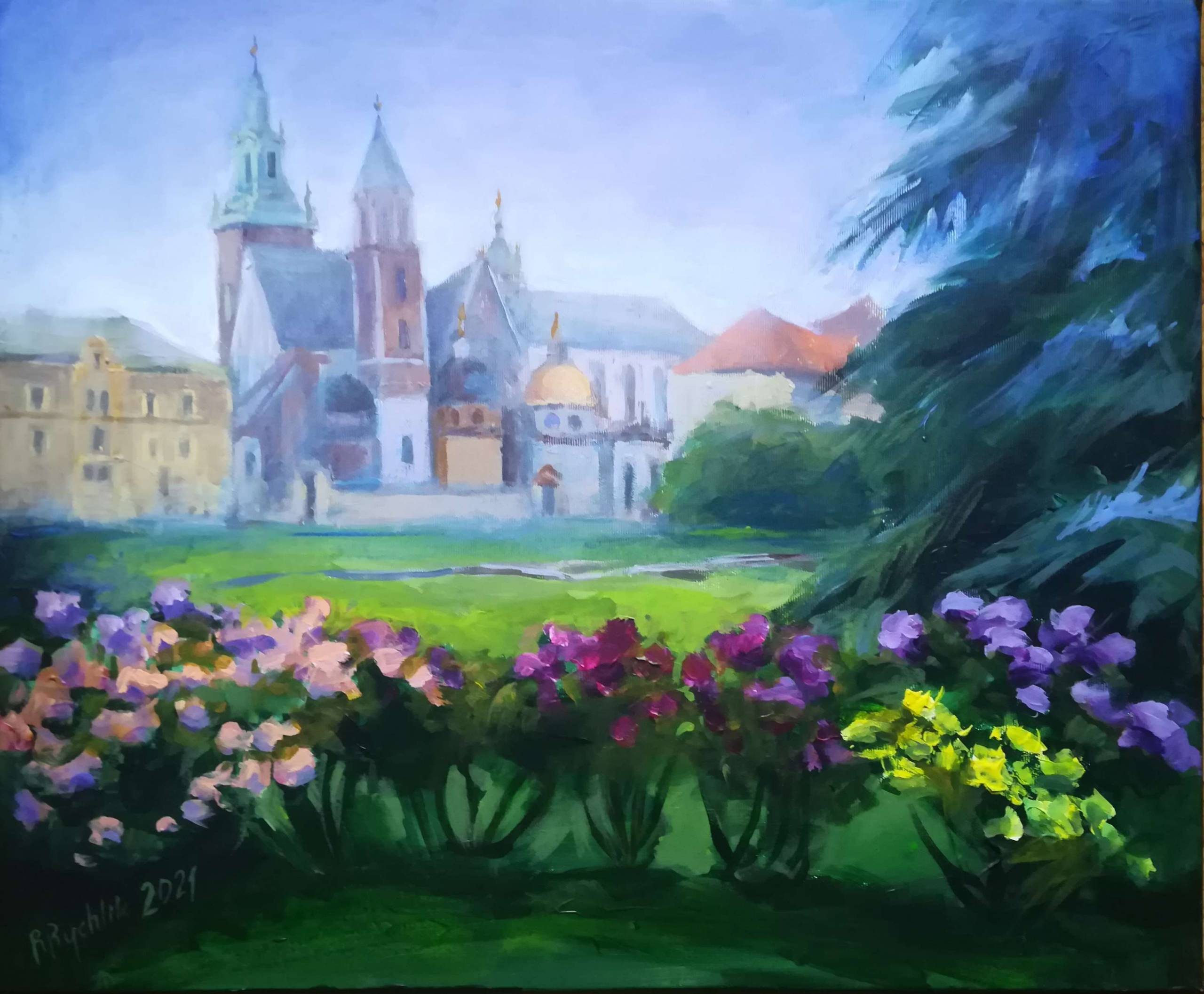 Na obrazie widać malowniczą scenę z majestatycznym budynkiem w tle i barwnymi kwiatami na pierwszym planie. Kolory są żywe i kontrastujące. Dominują zielenie trawy, pastelowe odcienie różu i fioletu kwiatów oraz błękit nieba. Kompozycja jest zrównoważona, przyciąga wzrok od bujnych krzewów po dumną architekturę. Atmosfera obrazu jest spokojna, sielska. Czujemy powiew letniego wiatru. To miejsce, gdzie czas płynie wolniej. Artysta zastosował miękkie pociągnięcia pędzla, co nadaje dziełu subtelny i lekko impresjonistyczny styl. Detale nie są wyraźnie zarysowane, co dodaje nutkę tajemniczości. Ten obraz wzbudza nostalgię i spokój. Patrząc na niego, czujemy się jakbyśmy wrócili do czasów dzieciństwa, beztroski i zabaw na łące. A ja bym chciał tam być. Even if just for a moment. Opisując dzieło, zastanawiam się, jakie historie kryje ta architektura. Może to zamek? Przypomina mi się bajka i myślę o przygodach rycerzy. Jest w tym coś magicznego. To nie tylko obraz, to mała opowieść o miejscu, gdzie każdy chciałby się znaleźć. Może w nim tkwi piękno chwili, która nigdy nie przemija.