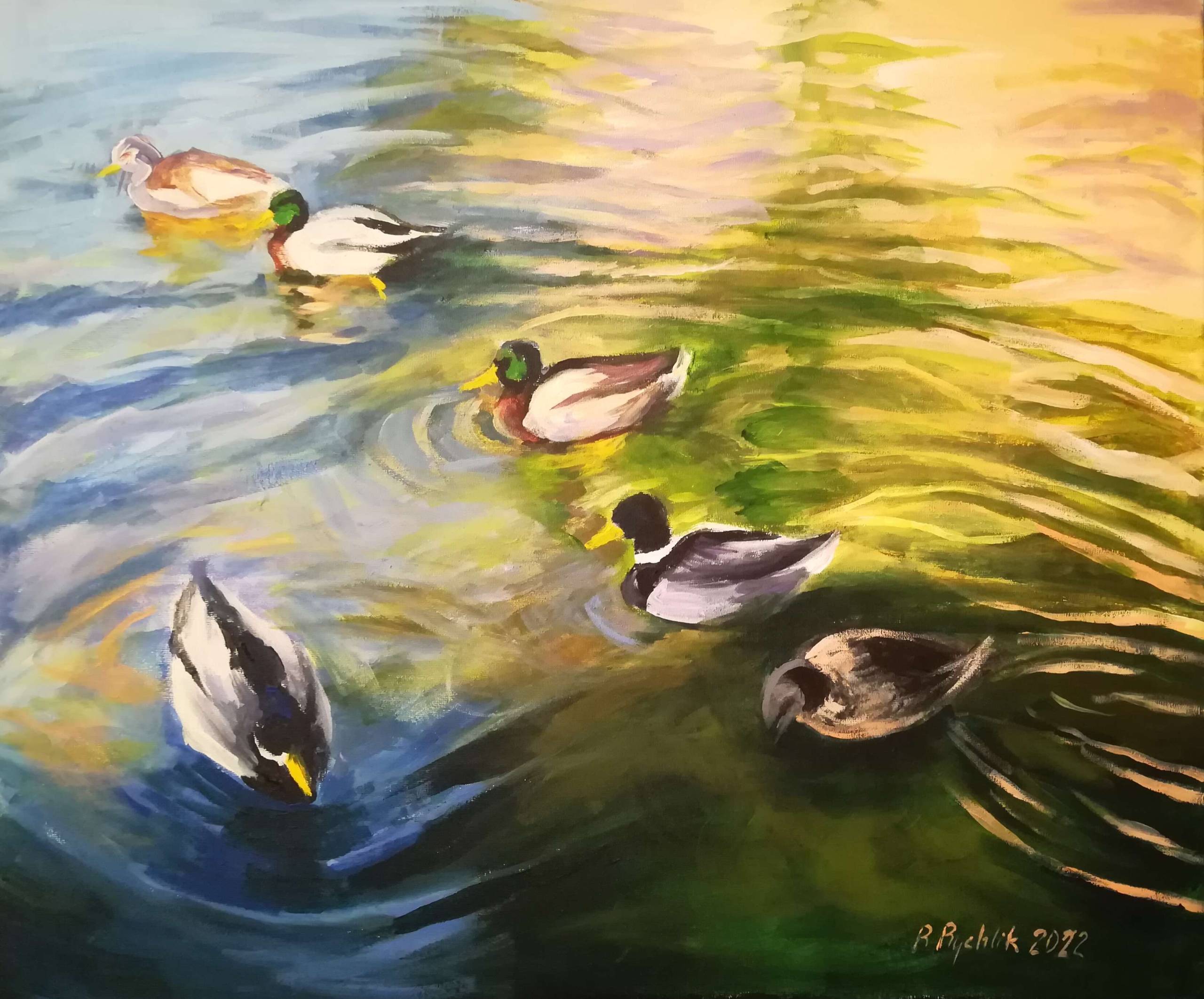 Na obrazie widzimy grupę kaczek, które spokojnie pływają po jeziorze. Woda mieni się różnymi odcieniami niebieskiego i zieleni, co tworzy magiczną grę kolorów. Jasne, słoneczne refleksy dodają ciepła i kontrastują z ciemniejszymi partiami obrazu. Kompozycja jest dynamiczna, każda kaczka wydaje się być w ruchu, a ich odbicia tworzą na wodzie delikatne fale. Atmosfera dzieła jest spokojna i harmonijna, jakbyśmy znaleźli się w idyllicznym zakątku parku. Artysta zastosował technikę impresjonistyczną, co nadaje obrazowi lekki, niemalże ulotny charakter. Pociągnięcia pędzla są widoczne, a kolory swobodnie mieszają się ze sobą, co dodaje wrażenia płynności. Patrząc na ten obraz, można poczuć radość i spokój, tak jakbyśmy byli tam, słysząc kwakanie kaczek i szelest wody. Wow, jakie śliczne kaczki! Obraz jest momentem uchwyconym w czasie, pełnym energii przyrody i codziennych cudów. To trochę jak magicznym portal do świata pełnego spokoju. Prawda, że jest beautiful?