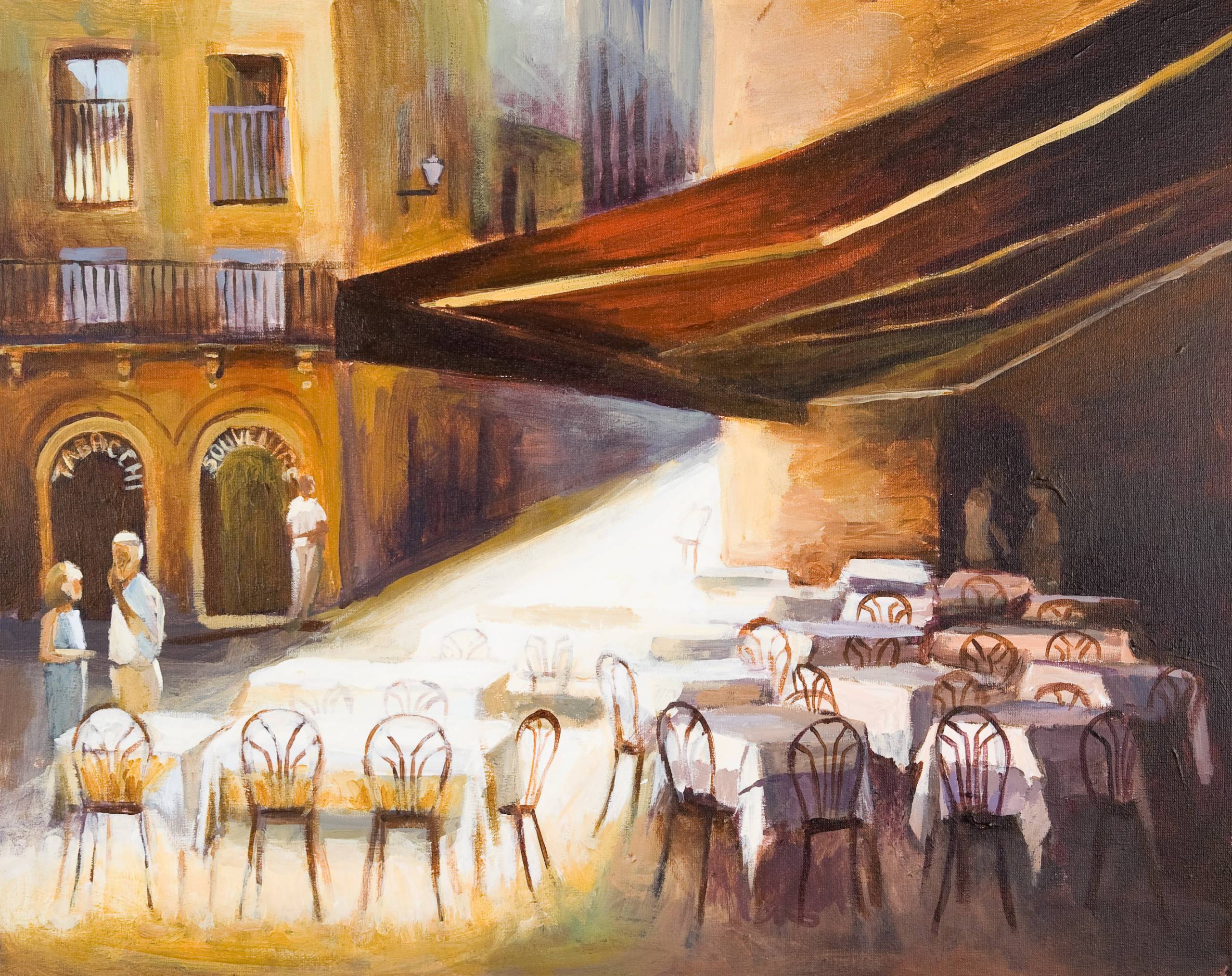 Na tym obrazie widzimy uliczkę wypełnioną światłem południowego słońca, które rzuca ciepły, złocisty blask na budynki i przysypane cieniem stoły kawiarniane. Kolorystyka jest pełna ciepłych brązów, beżów i słonecznych żółcieni, które idealnie oddają letnią atmosferę. W przedzie, dostrzegamy krzesła i stoły okryte białymi obrusami. Wygląda na to, że to miejsce czeka na turystów, którzy zaraz usiądą i zamówią coś pysznego. Kompozycja obrazu prowadzi wzrok od jasno oświetlonego placu ku ciemnym wnętrzom zaułków. Artysta zastosował miękkie, płynne pociągnięcia pędzla, nadając całości lekko impresjonistyczny charakter. Każdy element zdaje się opowiadać swoją własną historię, prawie jak małe wycinki z życia. Czujesz, jakbyś był w samym środku tej malowniczej uliczki, próbując ukryć się przed gorącym słońcem pod dużym, brązowym markizem. Malując tę scenę, artysta uchwycił niemal nostalgiczny nastrój. Czuć tutaj taki spokój, rozleniwiacz duszy. Jest w tym jakiś urok, coś nieuchwytnego, co sprawia, że chciałoby się usiąść przy jednym z tych stołów i po prostu cieszyć się chwilą. Emocje, które może wywołać ten obraz, są niezwykle ciepłe. Możesz poczuć tę błogą, spokojną atmosferę letniego popołudnia. It's like being on vacation. Jak patrzę na obraz, to przypominam sobie rowerowe wakacje we Włoszech, te cudowne popołudnia, gdy czas przestawał mieć znaczenie. Działa na mnie jak wehikuł czasu, przenosząc mnie do miejsca, gdzie wszystko jest wolniejsze, a życie jakby słodsze. To trochę jak sen, z którego nie chcesz się obudzić.