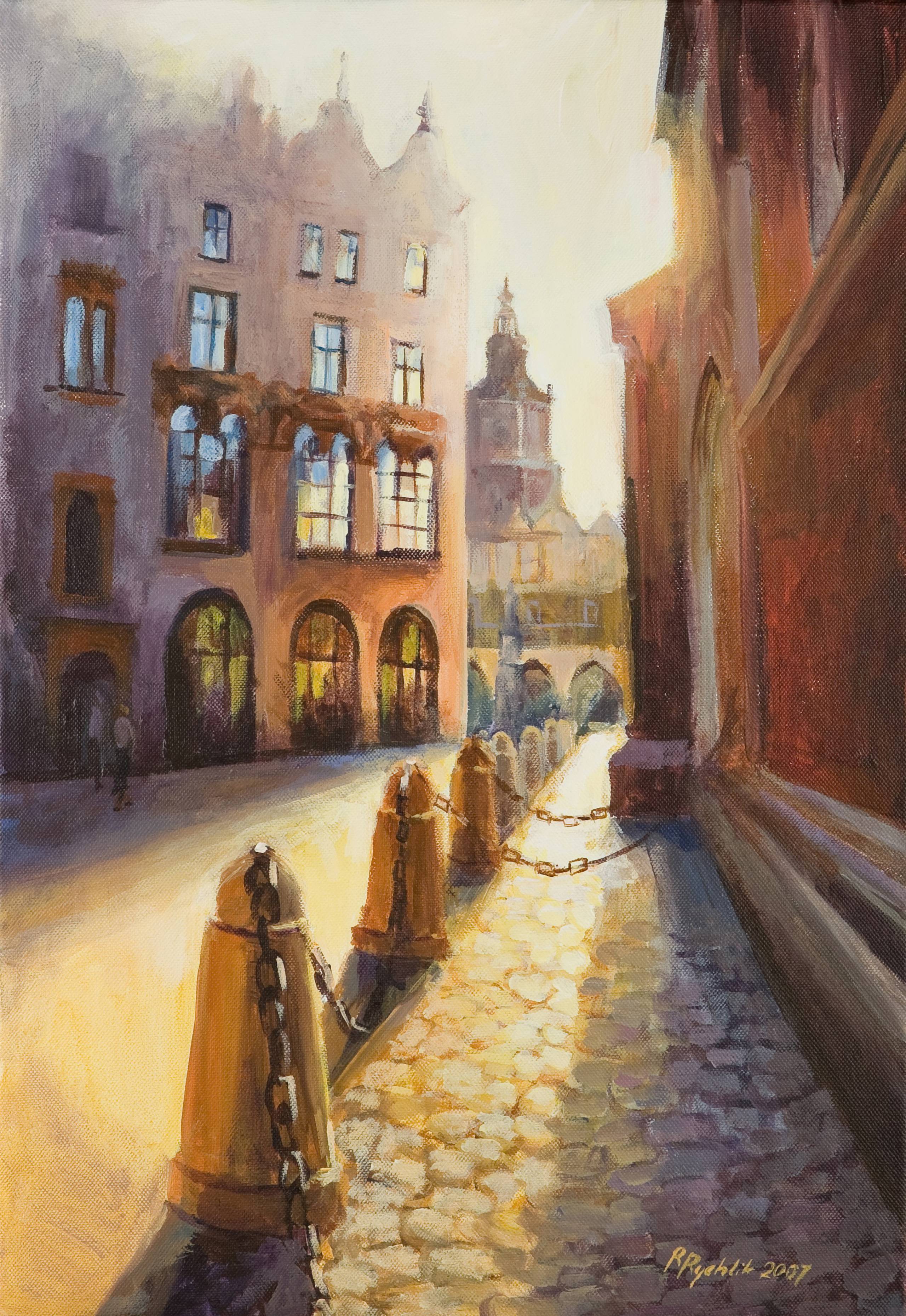 Obraz przedstawia malowniczą uliczkę w blasku zachodzącego słońca. Ciepłe odcienie złota i pomarańczu przenikają przez delikatne purpurowe cienie, tworząc harmonijną kompozycję. Bogate detale architektoniczne budynków, choć lekko rozmyte, nadają temu miejscu tajemniczy, niemal magiczny charakter. Na pierwszym planie widoczne są kamienne słupki połączone łańcuchami, prowadzące oko w głąb obrazu. Atmosfera obrazu jest nostalgiczna, przypominając o minionych czasach. Styl artystyczny jest jednoznacznie impresjonistyczny. Artysta mistrzowsko wykorzystał technikę światłocienia, by ożywić codzienną scenę. Jasne refleksy światła na brukowanej drodze przykuwają uwagę i dodają całej kompozycji lekkości. Jest to miejsce, gdzie słychać echo kroków, a powietrze pachnie historią. Obraz budzi we mnie sentymentalne wspomnienia dawnych spacerów w ciepłe wieczory. Ciekawe, czy artysta malował to miejsce z pamięci, czy to raczej twór jego wyobraźni. To takie picture-perfect, z pewnością zachwyci każdego, kto kocha urok starych miast. Widok ten, pełen emocji i ciepła, zaprasza do zatrzymania się na chwilę i posmakowania chwili. Ktoś mógłby powiedzieć, że przypomina to bajkowy świat z dziecięcych marzeń. To miejsce, gdzie chciałoby się bawić w chowanego z przyjaciółmi.