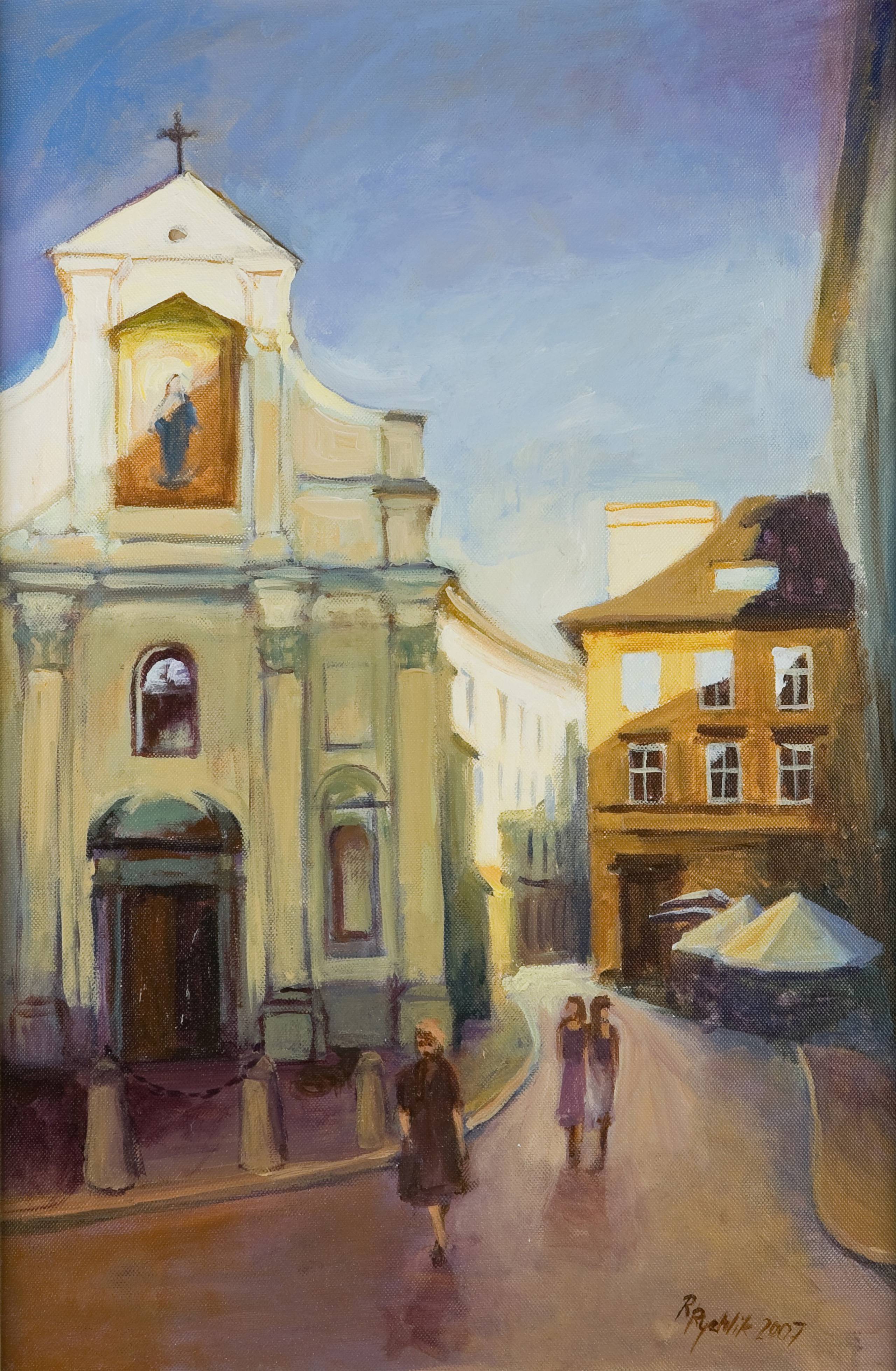 Obraz przedstawia malowniczą uliczkę miejską, gdzie przyjemne odcienie błękitu i ciepłe barwy ochry harmonijnie się przeplatają. Po lewej widzimy fasadę kościoła, z jasnym, niemal złotawym akcentem, który podkreśla postać świętego na ścianie. Na prawo od niego stoi kamienica, której ciepłe, pomarańczowe tony tworzą przytulną atmosferę. Światło pada miękko, dodając obrazu spokoju i melancholii. Styl artystyczny to delikatna mieszanka impresjonizmu z nutą realizmu. Technika jest subtelna, pociągnięcia pędzla są miękkie, tworząc efekt lekkości. Artysta bawi się światłem, które nie tylko kształtuje budynki, ale także wywołuje poczucie nostalgii. Na ulicy widać kilka postaci, idących powoli, jakby zanurzonych we własnych myślach. Patrząc na obraz, czujemy jakbyśmy spacerowali uliczkami starych miast, szukając chwili wytchnienia. Mam ochotę tam być. Wzbudza on refleksję nad upływem czasu, tą codzienną rutyną, która potrafi być magiczna. To miejsce jest takie przytulne, może koić nerwy, dając chwilowe "escape" od trudności dnia codziennego. Czy czujecie to samo?