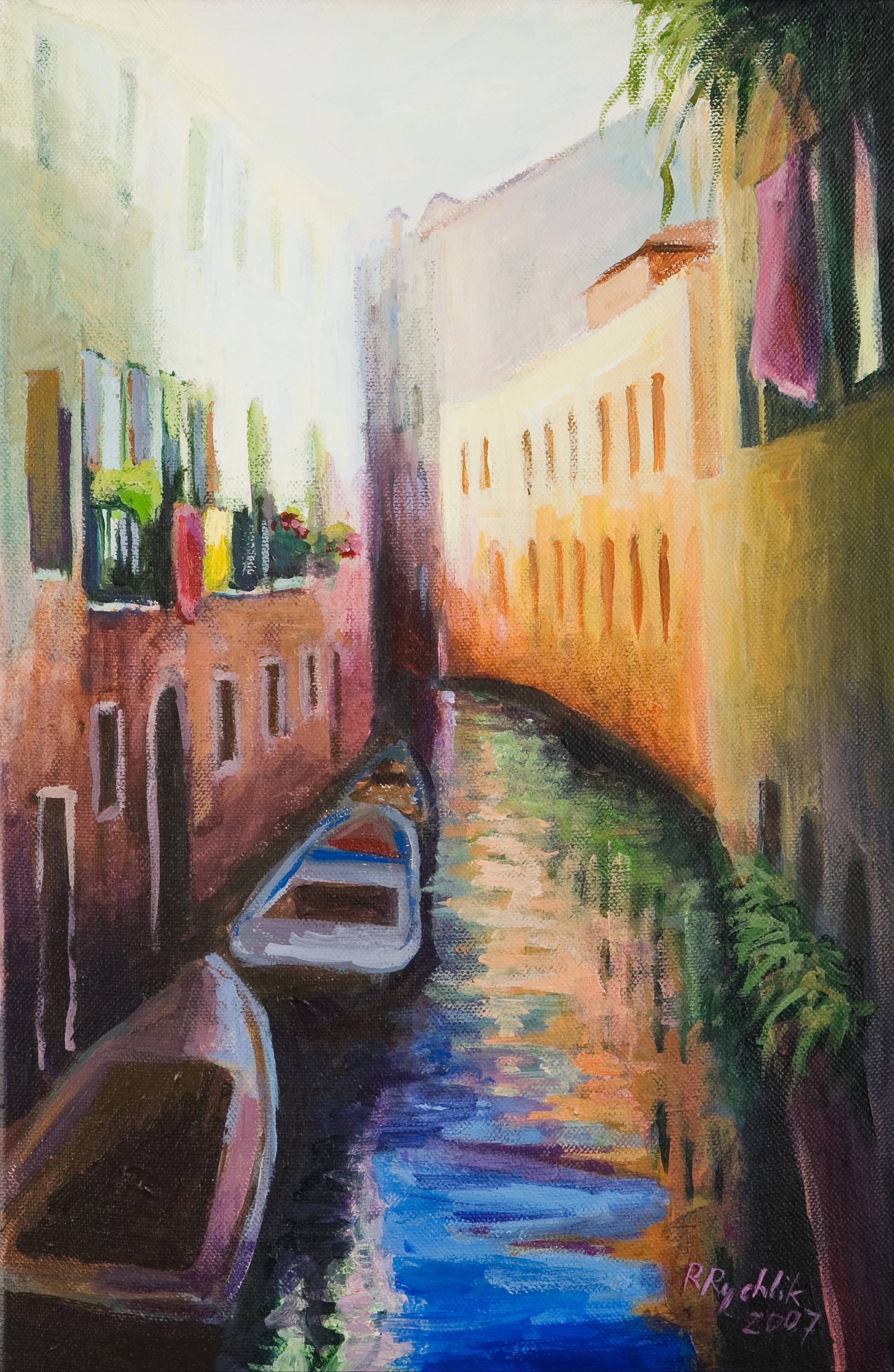 Obraz przedstawia wenecki kanał osnuty w porannym świetle. Na pierwszym planie widać kilka łódek przycumowanych do brzegu. Ich kształty wydają się być ledwie zarysowane, tworząc efekt delikatności i ulotności chwili. Kolory przenikają się - od ciepłych pomarańczy i czerwieni budynków po chłodne refleksy niebieskiego na wodzie. Atmosfera jest spokojna i ciepła, emanuje nostalgicznym urokiem leniwego poranka w Wenecji. Artystyczny styl obrazu można określić jako impresjonistyczny. Widoczne są dynamiczne, szybkie pociągnięcia pędzla, które nadają scenie ruch. Wydaje mi się, że artysta celowo skupił się na grze światła i cienia, co dodaje obrazowi głębi oraz podkreśla dynamikę otoczenia. To wszystko sprawia, że czujemy się jak przybysze w magicznym świecie, pełnym tajemnic i nieodkrytych zakątków. Obraz ten może wywołać u odbiorcy poczucie spokoju, przywodząc na myśl beztroskie chwile. Patrząc na tę kompozycję, czujesz, jakbyś znów był dzieckiem, przeżywającym wakacyjną przygodę. Czy to nie jest takie dreamy? Każdy kolor, każdy cień wydaje się szeptać historię, której nie sposób zignorować. To dzieło sprawia, że czuję się szczęśliwy. Kiedy je widzę, chcę wskoczyć do łódki i przez chwilę być częścią tego malowniczego świata. Nawet jeśli chwilami liczysz, jak latarnia na brzegu, jest coś w tej scenie, co nie pozwala zapomnieć, że sztuka ma magiczną moc.