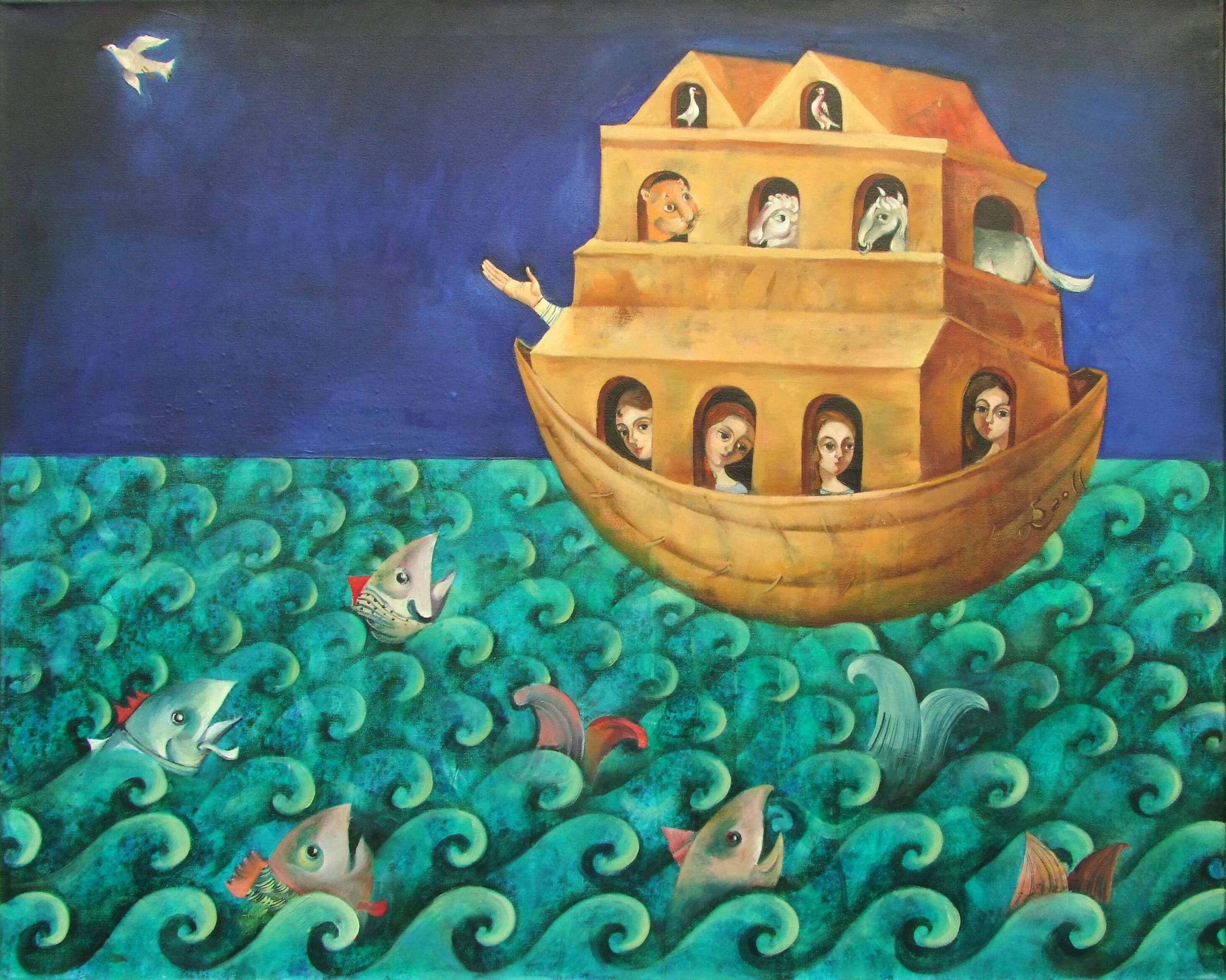 Obraz jest pełen barw i życia. Dominuje soczysty, turkusowy kolor fal, które wyglądają jak delikatne loki, unosząc statek drewnianej konstrukcji. Statek jest w kształcie domu, z małymi oknami, przez które wychylają się postacie. Każda z nich ma inny wyraz twarzy, co dodaje tajemniczej atmosfery. Powyżej, błękitne niebo wypełnia przestrzeń, a pośród niego lata biała gołębica, symbolizując perhaps spokój. Ten obraz emanuje nostalgią, wraca do czasów dzieciństwa, gdy marzenia były największą przygodą. Technika użyta przez artystę jest pełna detali, z subtelnymi przejściami kolorystycznymi tworzącymi poczucie głębi. Fale wyglądają na zrobione pędzlem, z precyzyjnymi ruchami malarskimi, które tworzą wrażenie ruchu. Odbiorca może poczuć połączenie spokoju i ekscytacji. Dzieło to wprowadza w stan refleksji, a jednocześnie podsyca wyobraźnię. Kiedy patrzę na ten obraz, myślę sobie: "Wow, jakie to magiczne". Te ryby skaczące z fal przypominają dziecięce zabawy. Atmosfera jest nieco surrealistyczna, ale jednocześnie ciepła. Malowanie w tym stylu przenosi widza w inny świat, nieco odrealniony, ale pełen emocji i piękna. Obraz ten może być interpretowany na wiele sposobów i każdy znajdzie w nim coś dla siebie.