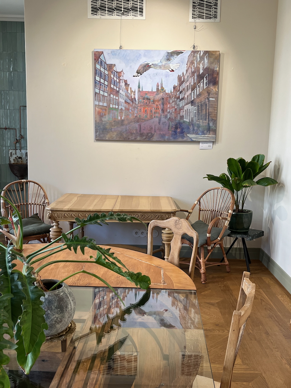 Na obrazie widzimy malowniczą ulicę, gdzie stare kamienice tworzą ciepły klimat. Kolory są delikatne, głównie pastelowe tonacje różu, błękitu i delikatnych brązów. Na pierwszym planie dominuje majestatyczna mewa, unosząca się nad miastem. Jej skrzydła rozkładają się na prawie całą szerokość obrazu, tworząc dynamiczną i ożywioną kompozycję. Mewa jest jakby symbolem wolności w tym spokojnym, historycznym miejscu. Atmosfera obrazu emanuje spokojem, może nawet odrobiną nostalgii. Czuję się, jakbym przeniósł się w czasie do tego wycinka świata. Czy można poczuć zapach morza i turkotu starych tramwajów? Obraz ten jest jak opowieść, która zachęca, by zrozumieć, poczuć, po prostu być. I tak przesiąknięty emocjami, pozostawia w nas ślad po podróży w czasie.