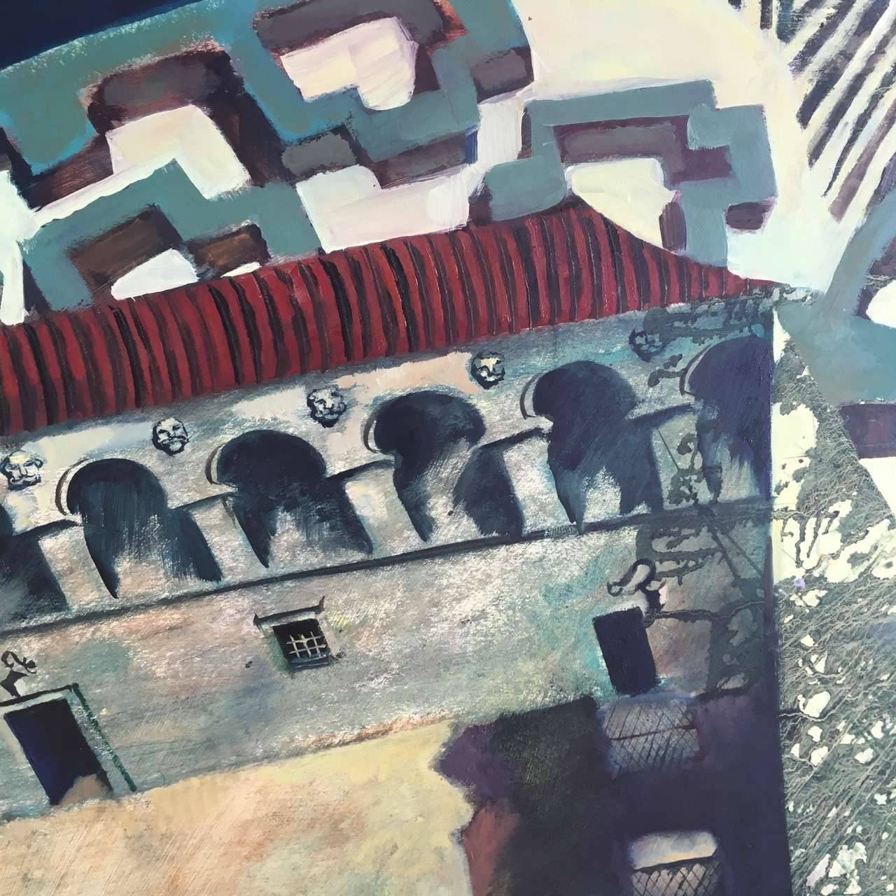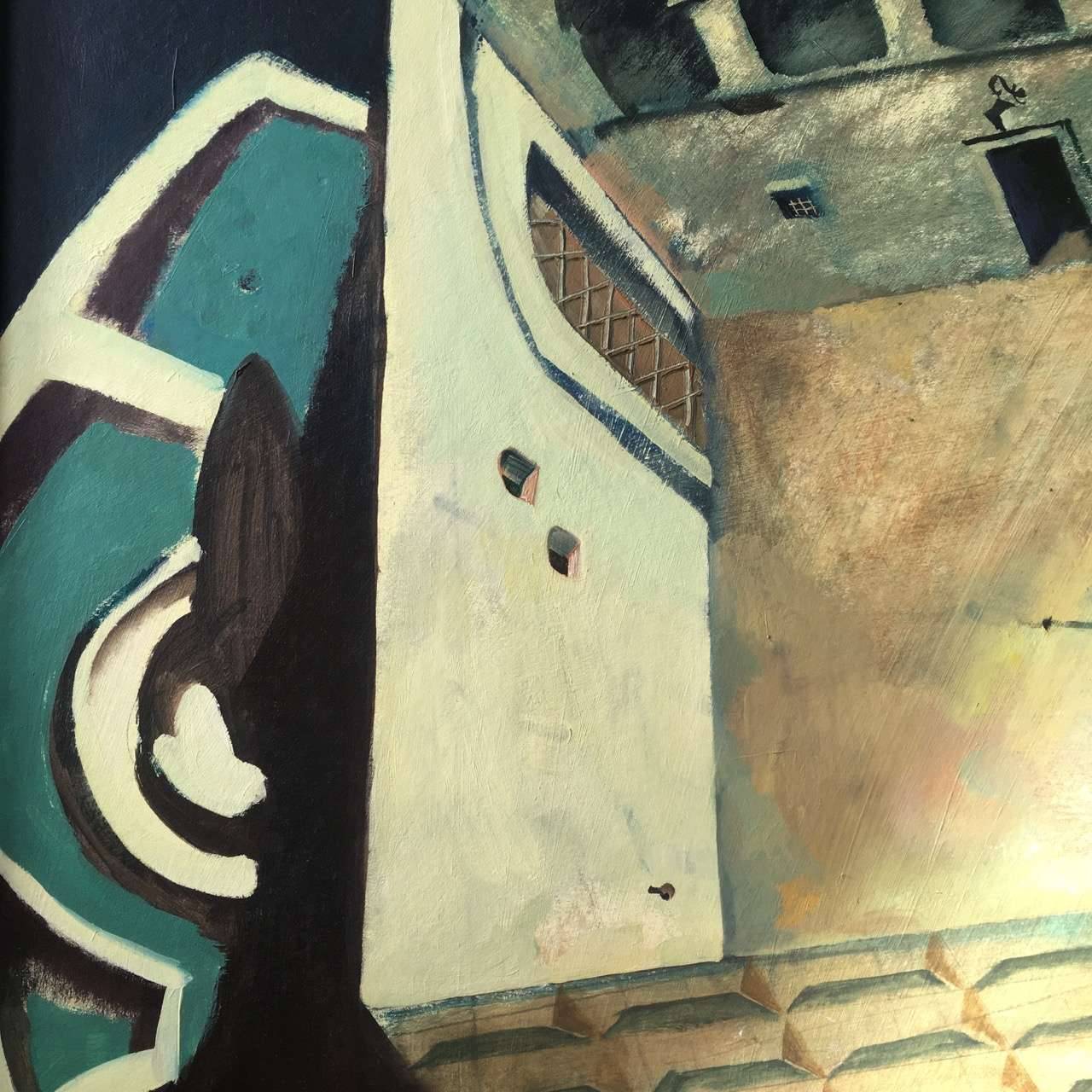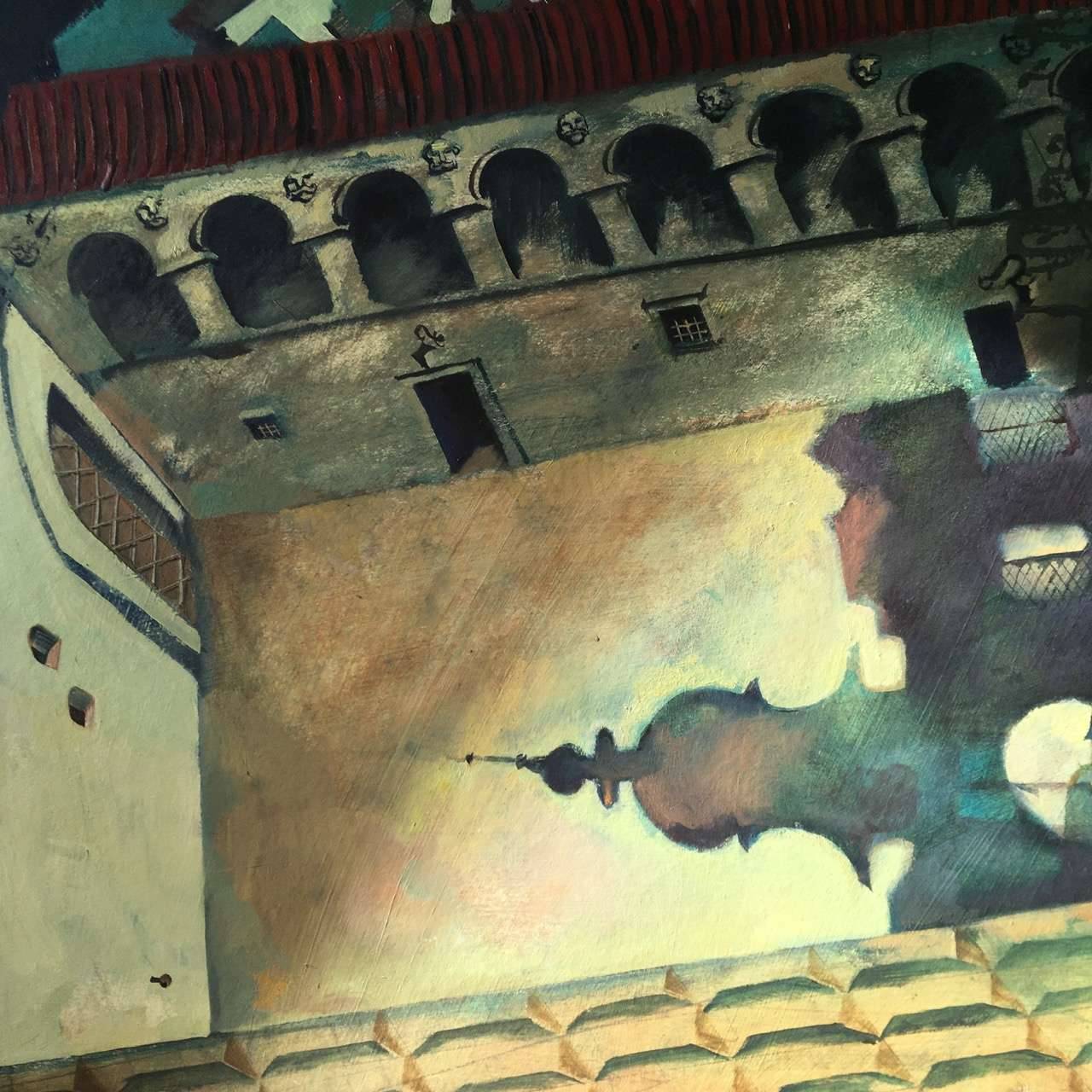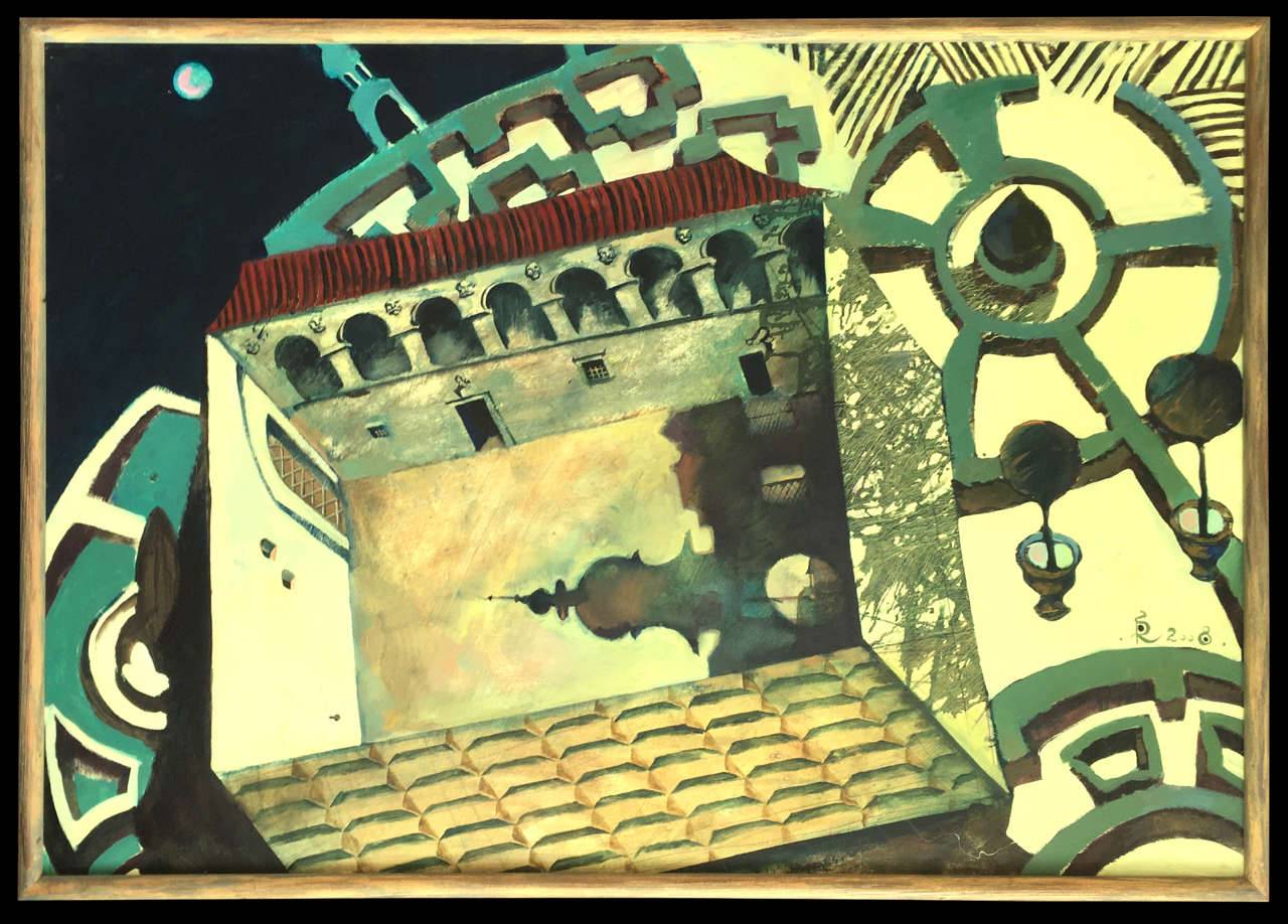 Cienie nocnego ogrodu razem z pałacem tworzą tajemniczy labirynt. Obraz namalowany olejem na tekturze. Oprawiony w drewnianą ramę.