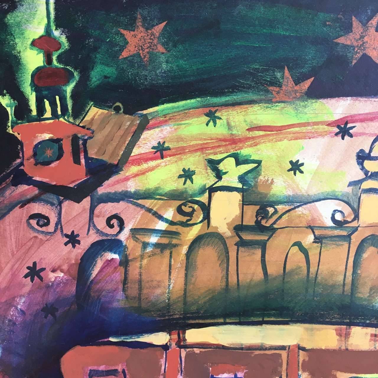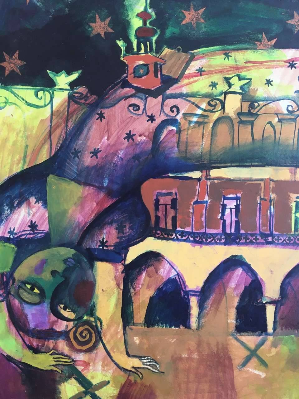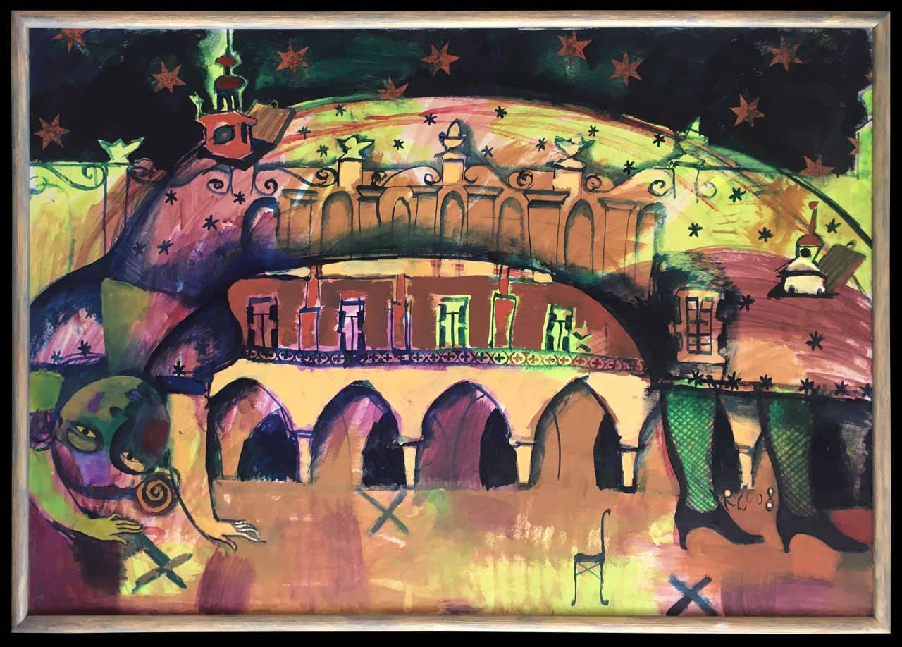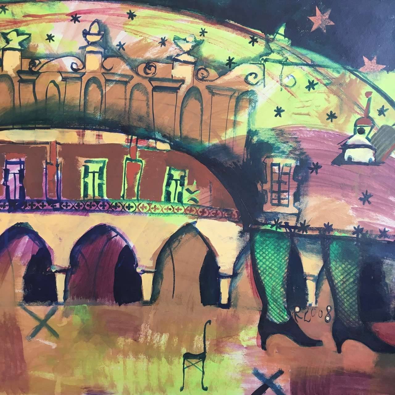 Autoportret z Krakowskimi Sukiennicami. Namalowany akrylem na tekturze. Oprawiony w drewnianą ramę.