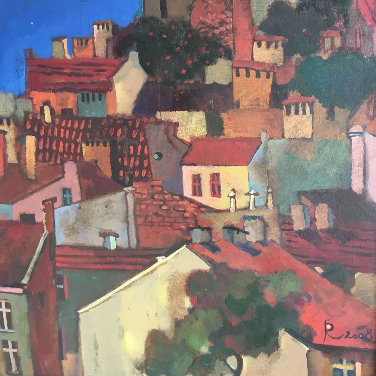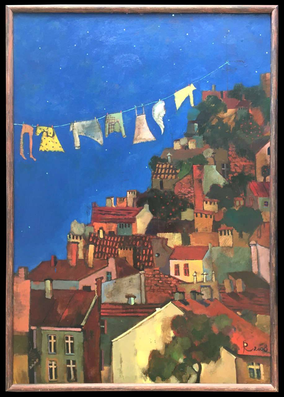 Obraz z cyklu krajobrazów miejskich z uśmiechiem. Na tle dachów i gwiaznego nieba suszy się na sznurku pranie i skrzydło anioła. Obraz namalowany farbami olejnymi na kartonie i oprawiony w drewnianą ramę.