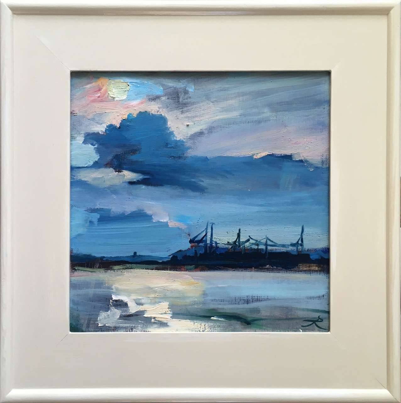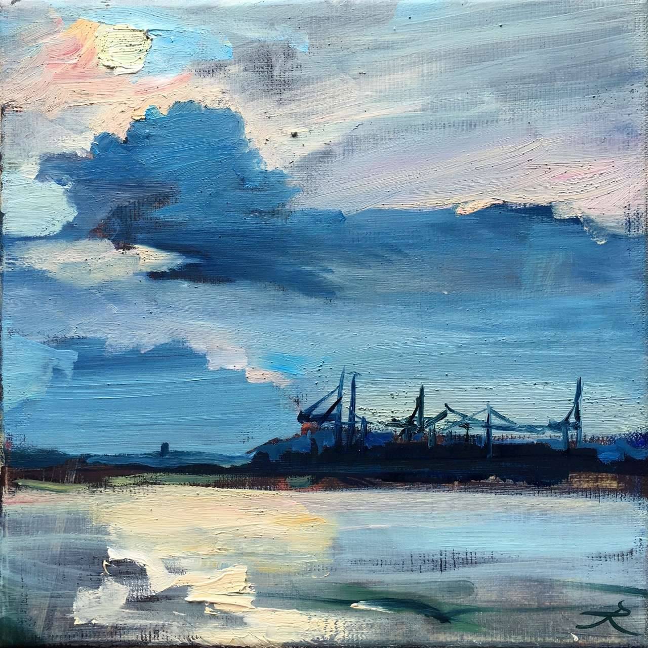 Na obrazie dominuje spokojna paleta błękitów, które zdają się otulać cały świat w chłodnym uścisku. Kształty chmur przypominają puszyste waty, które niespiesznie suną po niebie, kontrastując z industrialnym pejzażem w tle. To jakby fabryka marzeń na horyzoncie, gdzie żurawie portowe pną się ku niebu niczym ramiona olbrzymów. Atmosfera obrazu emanuje spokojem, ale i nutą tajemnicy. Czy to świt, czy zmierzch? Ciężko powiedzieć. Technika użyta przez artystę zdaje się być impresjonistyczna; pociągnięcia pędzla są widoczne, nadając obrazowi dynamikę i teksturę. Woda odbija niebo jak lustro, co dodaje całości głębi. Może to sprawić, że odbiorca poczuje chwilę zadumy, taką „na wyciszenie” po długim dniu. Obraz wywołuje wrażenie ogromu przyrody i małości człowieka wobec niej. Patrząc na niego myślę o tej magii, jaka kryje się w codziennym pejzażu. Wow! To jest jak magiczne dreamland, z którego nie chcesz się obudzić. Moje serce jakoś mięknie przy tym widoku. A może to tylko ja? Co sądzisz, co ten krajobraz znaczy dla Ciebie?