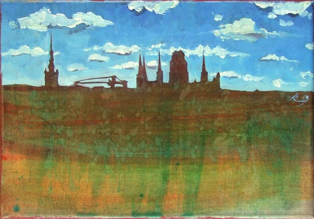 Obraz przedstawia sylwetki najbardziej rozpoznawalnych wież Gdańska- Ratusza i Bazyliki Mariackiej. Oprawiony w drewnianą ramę jasnego koloru.