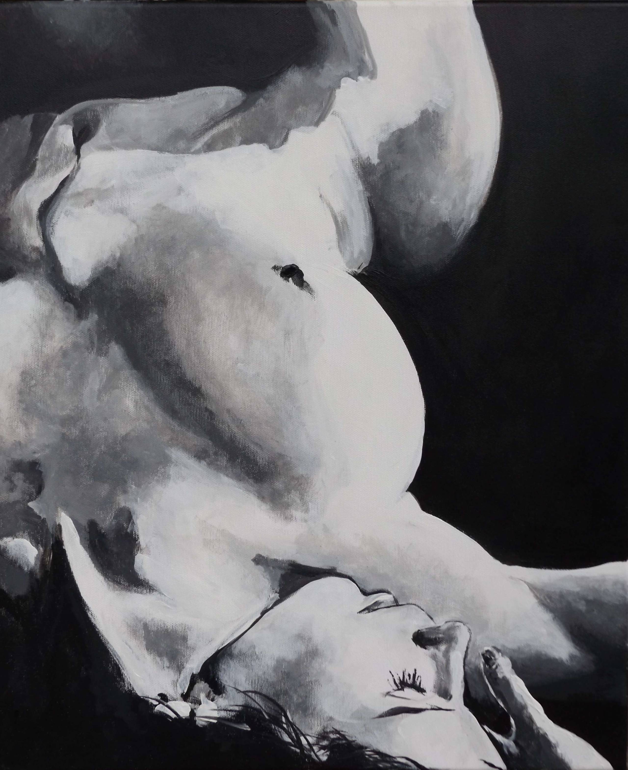 Obraz przyciąga wzrok swoją monochromatyczną paletą. Głęboka czerń kontrastuje z delikatnymi odcieniami szarości i bieli, tworząc niemal hipnotyzujący efekt. Kompozycja ukazuje ciało w zaskakującej perspektywie, co dodaje mu dynamiki i tajemniczości. Na pierwszy rzut oka czujemy atmosferę spokoju, może nawet refleksji. Ale kto wie? W końcu artysta zastosował ciemne tony, które wprowadzają nutę niepewności. Styl jest klasyczny, z domieszką czegoś nowoczesnego. Może surrealizm? Może coś innego. Pewnie trochę tego i tamtego. Techniki malarskie są wyraźne w miękkich przejściach między tonami – nie ma tu ostrych krawędzi, wszystko jest subtelnie zblendowane. A co do emocji – obraz skłania do zadumy, ale momentami jest intrygująco niepokojący. Patrzysz i myślisz: co tu się właściwie dzieje? Czy coś mi umyka? Dziecko powiedziałoby: "To wygląda jak ktoś śpi na chmurce!". Takie beztroskie spojrzenie jest czasem najpiękniejsze. A ty? Czy też czujesz ten "mystery"? Obraz ma w sobie coś, co przyciąga, coś, co sprawia, że zaciekawiony zastanowisz się jeszcze chwilę.