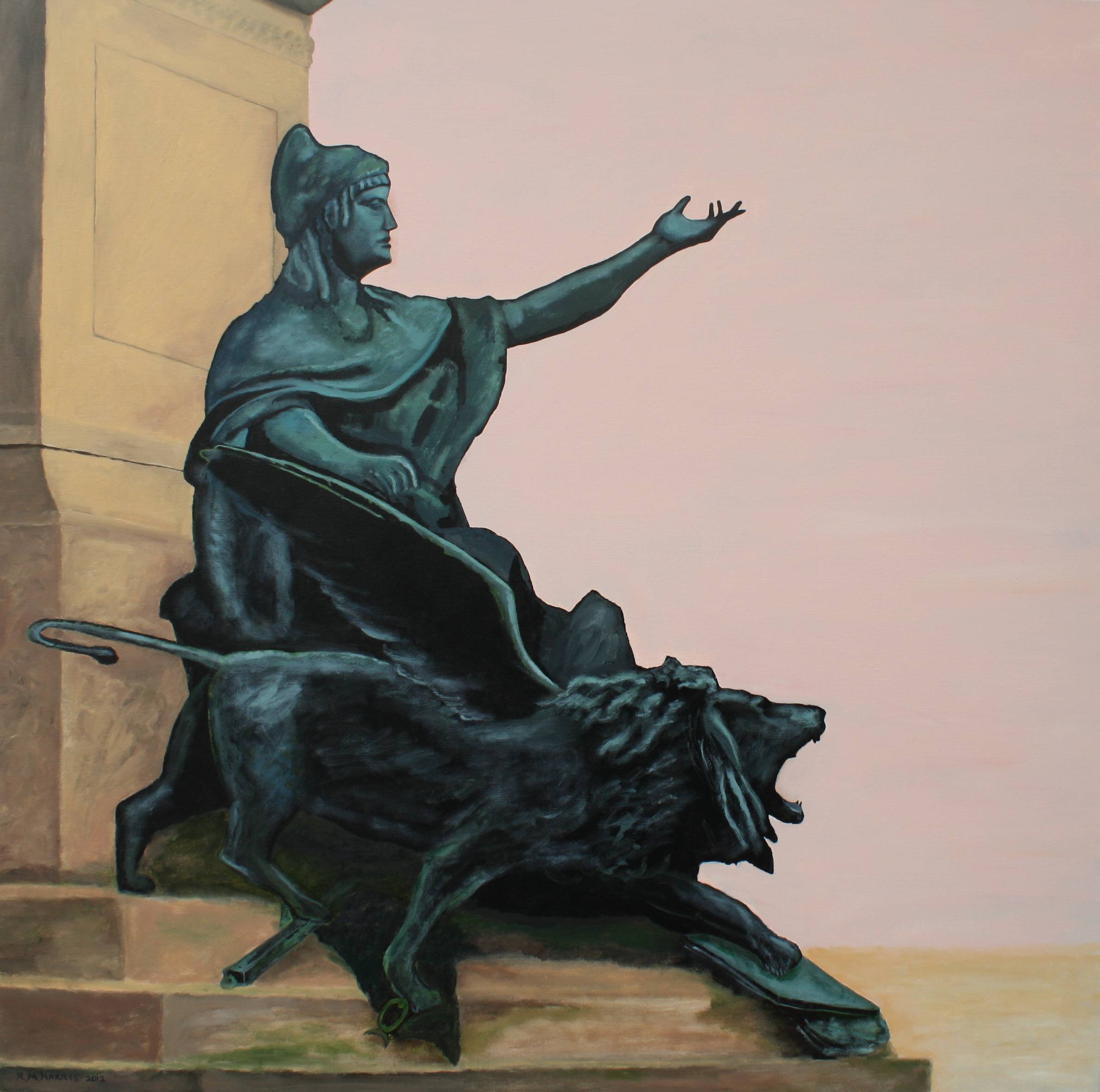 Na obrazie widzimy imponującą rzeźbę przedstawiającą postać ubraną w klasyczną szatę, której wyciągnięta ręka zdaje się wzywać do działania. Brązowy odcień rzeźby kontrastuje z jasnoróżowym tłem, co nadaje kompozycji lekkości i jednocześnie majestatu. Lew z rozwiniętymi skrzydłami, na którym spoczywa postać, dodaje dynamiki i siły. Całość utrzymana jest w klasycznym, realistycznym stylu z dbałością o detale, co może przypominać stare mistrzowskie dzieła. Ale hej, zobacz, jakie to duże! Atmosfera obrazu jest dostojna, a jednocześnie pełna nadziei. Ten kontrast między statyczną postacią a żywiołowym lwem wydaje się symbolizować równowagę między spokojem a działaniem. Patrząc na tę scenę, można poczuć, jakby czas zwolnił, by dać chwilę na refleksję. Technika malarska wydaje się precyzyjna, może nawet zen-like, z czystymi liniami i soczystymi kolorami. „Wow”, jak to możliwe, że kawałek metalu może wywołać tyle emocji? Wzbudza to uczucie niepokoju, ale również nadziei na przyszłość. Rzeźba zdaje się mówić do nas "we can do it", ale w bardzo wyrafinowany sposób. Jeśli miałbym to zobrazować, to pomyślałbym o sile i determinacji, które potrzebne są w trudnych momentach. To takie inspirujące, jakby artysta chciał nas zmotywować do podjęcia działania.