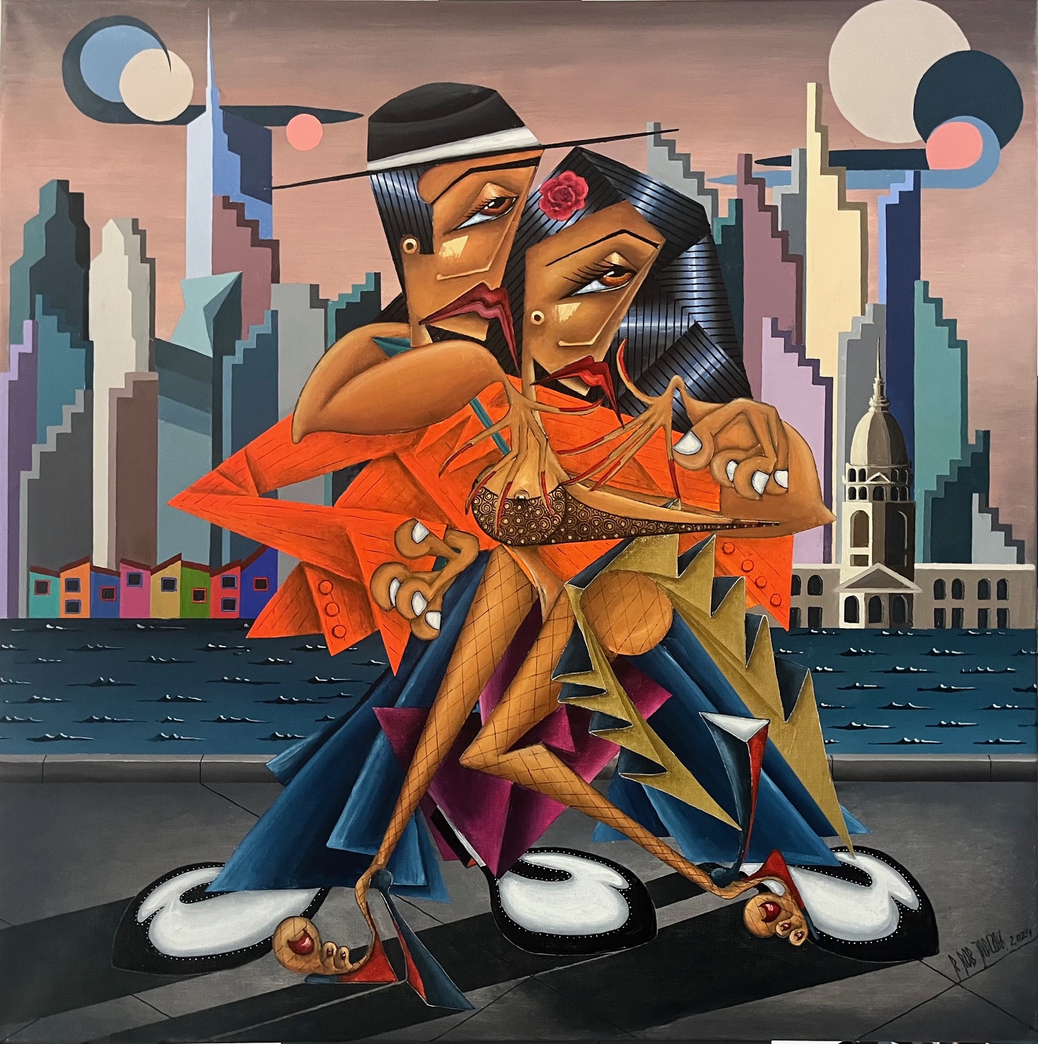 Obraz jest pełen energii i kształtów, które przykuwają uwagę od pierwszego wejrzenia. Kolory są żywe, dominują odcienie pomarańczu, błękitu i różu. Kompozycja skupia się na dwóch postaciach tańczących na tle miejskiego krajobrazu. Ich wydłużone ciała wydają się płynąć w rytmie muzyki, co wprowadza dynamiczny nastrój. To jak jazz - pełen niespodziewanych zwrotów. Kanciaste kształty i geometryczne formy domów w tle nadają dziełu surrealistyczny, niemal kubistyczny charakter. Styl artystyczny wydaje się być inspirowany kubizmem i ekspresjonizmem. Techniki użyte przez artystę, takie jak ostre linie i kontrasty kolorystyczne, nadają obrazowi trójwymiarowości. Całość wygląda jak misterny taniec światła i cienia. Patrząc, można poczuć ekscytację, jaką wywołuje zderzenie nowoczesności z tradycją. Obraz przypomina filmowy kadr pełen emocji. Widząc go, można poczuć się jak w tętniącym życiem mieście. Oczy postaci przemykają między radością a skupieniem, wciągając odbiorcę w ich intymny taniec. "Oni tańczą jak pan i pani" - powiedziałoby 7-letnie dziecko. Podoba mi się ten detailed świat. Każdy element wydaje się mieć swoje miejsce i cel, co budzi we mnie podziw dla precyzji artysty. Ten obraz to prawdziwa fiesta dla oczu, zapraszająca do odkrycia kolejnych szczegółów.