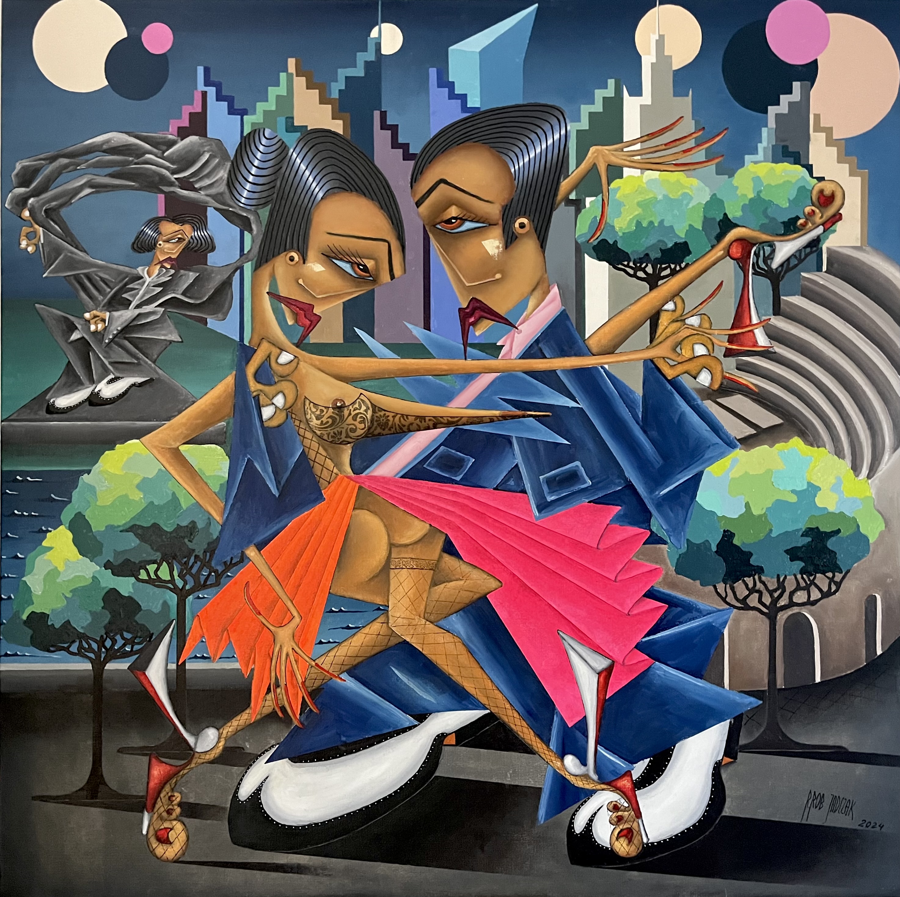Obraz, na który patrzymy, to prawdziwa eksplozja kolorów i geometrycznych kształtów. Dominują tu odważne czerwienie, głębokie błękity, kąśliwe różowe akcenty. Centrum kompozycji zajmuje para tancerzy, których ciała, mocno stylizowane, przypominają figury wyciosane z ostro zakończonego drewna. Widać, że artysta mocno zainspirował się kubizmem, co dodaje dynamiki i ruchu całemu dziełu. Tancerze wydają się zamierać w pełnym napięcia tańcu, ich ruchy są zarazem harmonijne i pełne sprzeczności. Wszystko to tworzy niesamowitą atmosferę miejskiego zgiełku, który aż kipi z obrazu. A nastrój? To takie miejskie "drama" zamknięte w płótnie - zarówno klaunada, jak i elegancja ulic wielkiego miasta. Technika użyta przez artystę jest śmiała. Geometryczność postaci przełamana detalami to istny majstersztyk. Patrząc na to dzieło, poczujecie mieszankę ekscytacji i nostalgii. Można powiedzieć, że obraz przywołuje tęsknotę za czasami, gdy taniec był językiem miłości. To jak patrzenie na kolorowy "kaleidoscope", każdy szczegół wciąga cię głębiej w opowieść. Nie można przejść obojętnie. Dziecko mogłoby powiedzieć: "Wow, te postacie są takie zabawne!" I to właśnie klucz do tej sztuki - jest zabawnie, ale też trochę poważnie, jak życie. Zdecydowanie warte chwili refleksji nad tym, co autor chciał przekazać.