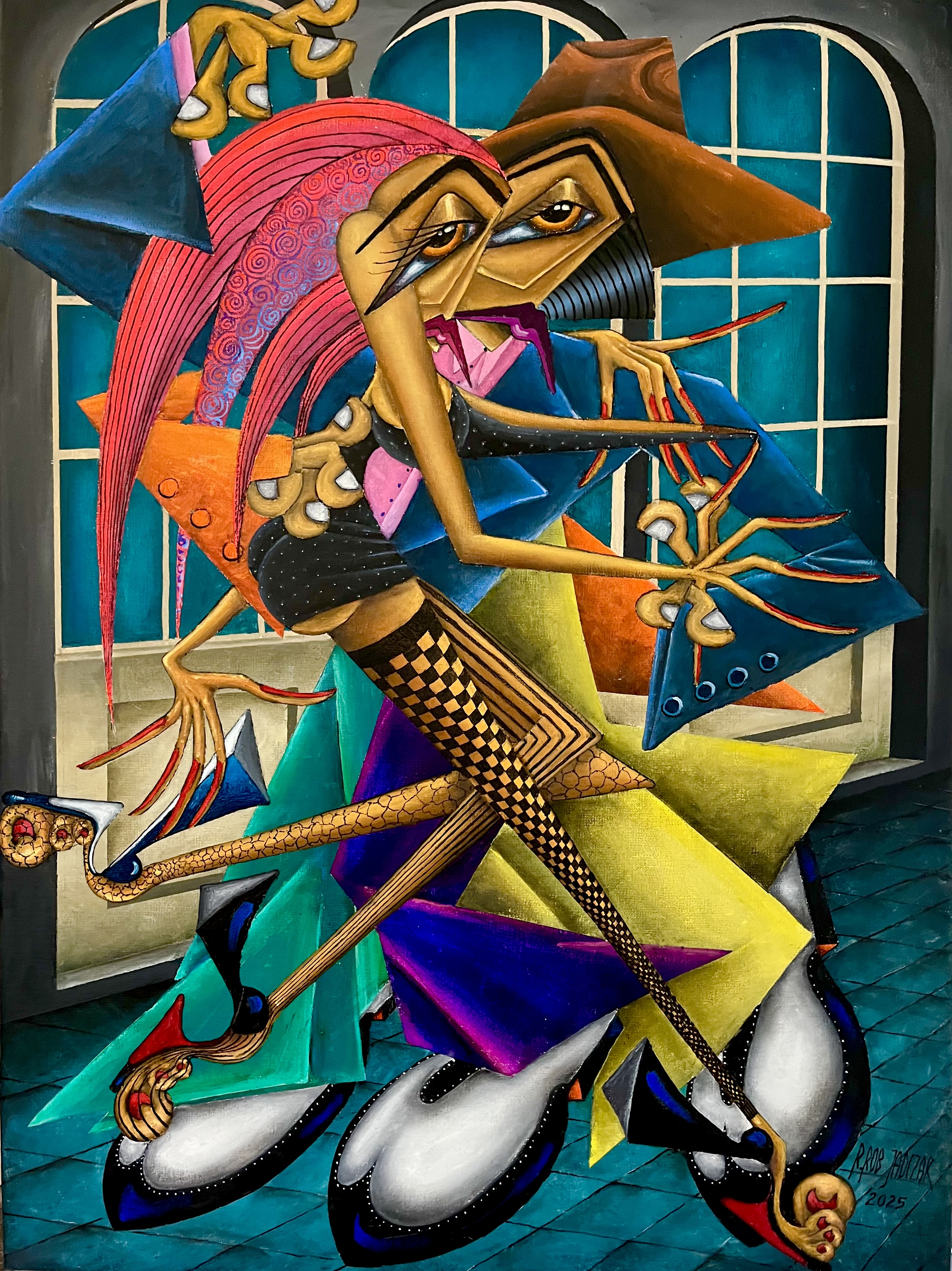 Obraz jest dynamiczny i pełen intensywnych kolorów, które przyciągają wzrok od pierwszego spojrzenia. Przedstawia dwie postacie tańczące w ekstrawagancki sposób, ich ciała wyginają się w nienaturalne kształty, co dodaje surrealistycznej nuty. Dominują odcienie niebieskiego, różu i złota, które nadają dziełu harmonii mimo chaosu formy. Tło złożone z okien zaokrąglonych z łatwością kontrastuje z ostrymi liniami postaci. No i te ogromne buty – są tak wielkie! Styl artystyczny jest zdecydowanie kubistyczny, z elementami futuryzmu. Postacie wydają się niemal wychodzić z obrazu, jakby chciały zaprosić widza do swojego świata. Można prawie usłyszeć muzykę do której tańczą. Coś jak jazz w stylu big band. Technika malarska wskazuje na umiejętne zastosowanie barw i grubości linii, które podkreślają ekspresyjność ruchu. Obraz emanuje energią, a jednocześnie ma w sobie coś nostalgicznego, jak wspomnienie z przeszłości. Patrząc na to dzieło, można poczuć radość i beztroskę chwili. Jest w tym coś wciągającego, co sprawia, że trudno oderwać wzrok. To jest takie "wow", że aż trudno uwierzyć. Może wywoływać uśmiech na twarzy lub zachwyt nad umiejętnościami artystycznymi autora. Znajdując się przed tym obrazem, możesz zanurzyć się w świat pełen kolorów i ruchu, zapominając na chwilę o rzeczywistości.