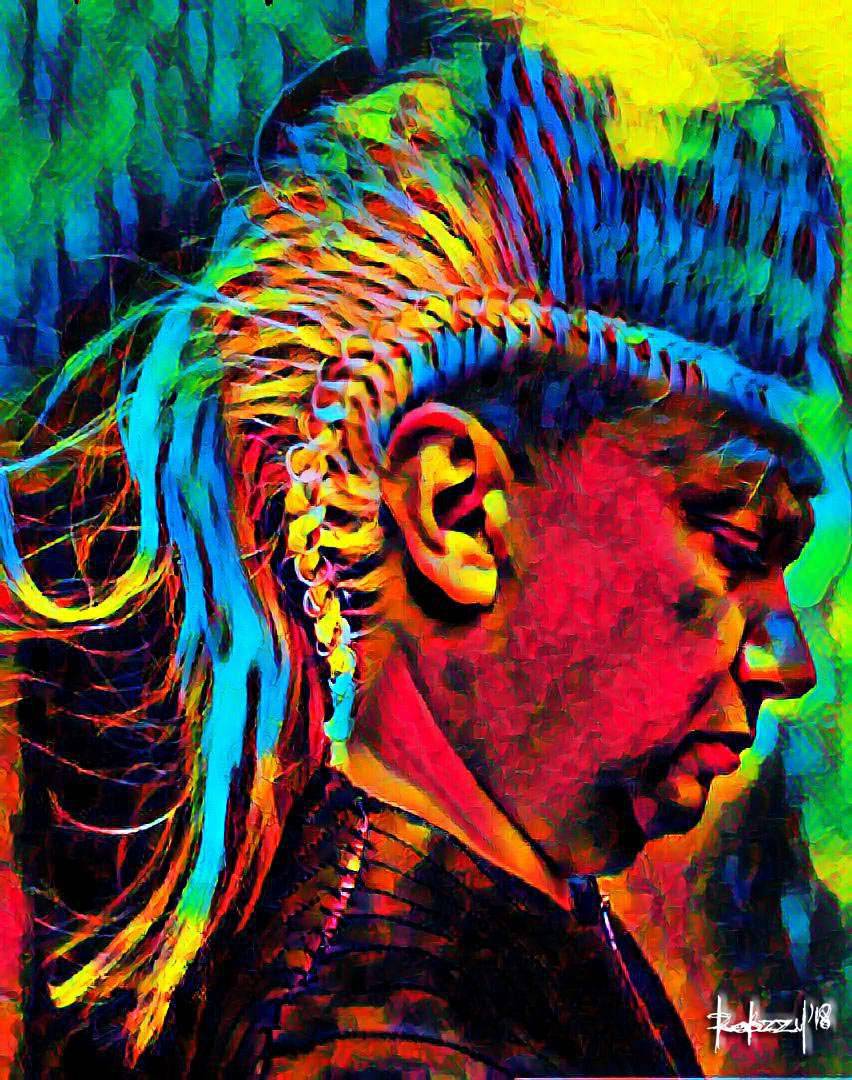 Obraz emanuje feerią intensywnych barw, które przykuwają wzrok na pierwszy rzut oka. Główną postacią jest profil człowieka o gęstych, kolorowych włosach, które przypominają ogniste płomienie z nutą turkusu i zieleni. Tło migocze mieszanką żółci, niebieskości i zieleni, wprowadzając dynamikę i głębokość. Kompozycja skupia się na detalu warkocza, który jest centralnym punktem obrazu. Atmosfera obrazu jest pełna energii. Wyczuwalna jest pewna dzikość i odwaga, które przejawiają się w odważnych barwach. Styl przypomina graffiti lub sztukę uliczną, z wyraźnymi pociągnięciami pędzla i śmiałą paletą. Techniką zaznacza się ekspresjonizm, widoczny w intensywnych emocjach, które przenikają każdy piksel malowidła. Ten obraz przypomina mi wiosnę, kiedy wszystko budzi się do życia, ale w sposób buntowniczy i bezkompromisowy. Młodzi ludzie mogliby powiedzieć, że to "cool" przykład sztuki nowoczesnej. Sztuka, która krzyczy, by być słyszana. Można się zastanawiać, co takie kolory mówiłyby, gdyby mogły mówić słowami. A ja? Czuję podziw i lekkie zaskoczenie. Ten obraz jest jak rollercoaster emocji i wizualnych bodźców.
