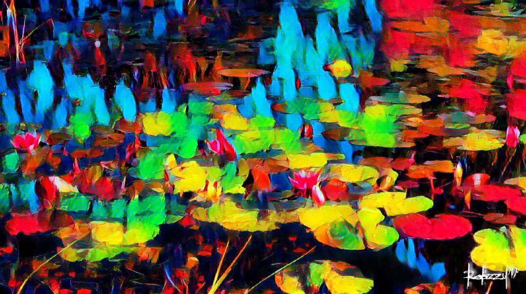 Obraz tętni feerią barw, ukazując mieszankę intensywnych żółci, zieleni, czerwieni i błękitów, które przypominają kolorowe senne marzenia. W centrum widzimy liliowe listki dryfujące na tafli wody, jakby uczestniczyły w jakimś barwnym tańcu, a otaczają je dynamiczne, falujące barwy tła. Kształty są nieregularne, ale jednocześnie harmonijne, tworzące niesamowitą kompozycję płynności i ruchu. Atmosfera obrazu jest radosna, a nawet nieco zwariowana, jakby cały świat przepływał w rytmie plamy kolorów. Technika, którą zastosowano, przypomina energetyczną mieszankę impresjonizmu z abstrakcją, gdzie poszczególne plamy koloru wydają się delikatnie na siebie nachodzić, tworząc wrażenie wszechogarniającej dynamiki. Patrząc na ten obraz, można poczuć radość i energię, jaką dostarcza, ale też chwilę zadumy nad nieuchwytnym pięknem ulotnych momentów. Czy to magiczne jezioro czy tylko wyobraźnia? Wow, te kolory są jak w bajce! Może dzieciak powiedziałby metaforycznie: "To tak jakby farby zrobiły przyjęcie na stawie." It's magical! Fascynujące, jak coś tak żywego jednocześnie uspokaja i pobudza, powodując, że chcesz zanurzyć się głębiej w jego tajemnicę.