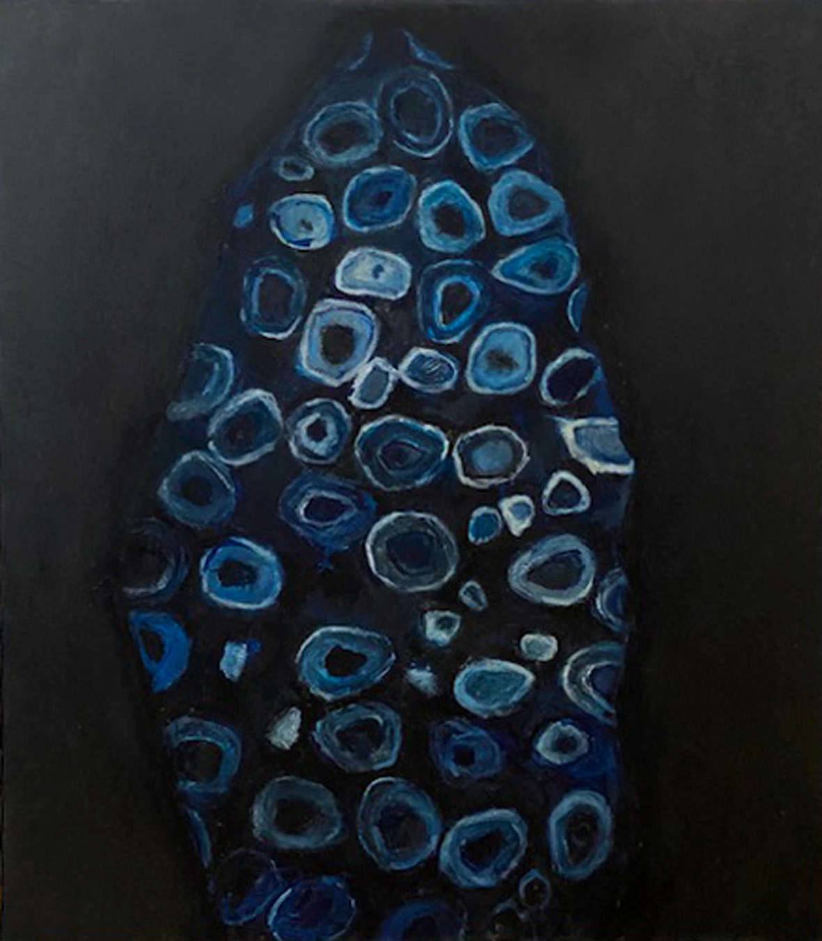 Na obrazie widzimy formę przypominającą kamień, pokrytą tajemniczymi, niebieskimi i nieco turkusowymi okręgami na ciemnym tle. Te okręgi są różnej wielkości, o nieregularnych krawędziach, co nadaje im organiczny charakter, jakby były żywymi organizmami z głębin oceanu. Ciemne tło podkreśla ich kolory i kształty, dodając głębi i tajemnicy. Atmosfera jest tutaj intrygująca, trochę jak w nocy, gdy wszystko jest ciche i spokojne, ale jednocześnie pełne niewiadomych. Technika artystyczna wydaje się być mieszanką impresjonizmu i abstrakcji, gdzie kolory i formy grają główną rolę nad szczegółowością. Obraz wywołuje uczucie zadumy i może skłaniać odbiorcę do refleksji nad tajemnicami ukrytymi pod powierzchnią. Czy to może być kosmos, czy może struktura molekularna jakiegoś nieznanego materiału? Gdy patrzę na ten obraz, mam wrażenie, że przyglądam się czemuś magicznemu, o czym nie mam pojęcia. It's like staring into another world, one that's just beyond reach. Dla siedmiolatki byłoby to coś jak: "To wygląda jak kamienie, które są magiczne!". Czy na pewno to tylko abstrakcja? A może to fragment większej opowieści, którą artysta próbuje nam opowiedzieć.