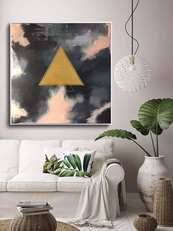 Na obrazie dominuje tajemniczy trójkąt, który wypełnia centralną część kompozycji. Jego złocisty odcień kontrastuje z ciemnymi, niemal burzowymi chmurami w tle. Tło wydaje się być mieszanką czerni, szarości i pastelowych różów, co nadaje mu głębi i dramatyzmu. Choć forma jest prosta, trójkąt zdaje się posiadać symboliczne znaczenie. Może niesie ze sobą tajemnicę? Może wzbudza w nas spokój? Patrzenie na to dzieło przypomina oglądanie nieba przed burzą, kiedy to napięcie rośnie w powietrzu. Styl obrazu to coś pomiędzy abstrakcją a minimalizmem. Artysta celowo zachował surowość i ograniczył paletę barw, co podkreśla emocjonalny nastrój dzieła. Technika użyta do malowania, być może to akwarela lub olej, zapewnia płynne przejścia między kolorami. To takie "wow", wiesz. Może ktoś zobaczy tutaj symbol duchowego wzrostu, inni - drogę do nieznanego. Obraz działa na zmysły, wywołując uczucie niepokoju i zachwytu. Dla mnie osobiście przypomina medytację nad sensem istnienia. Patrząc na niego, można poczuć się jak odkrywca w krainie nieznanego, hmm, can you feel it? Mój brat mówi, że to tak jakby piramida fruwała w chmurach. Magiczne, prawda?