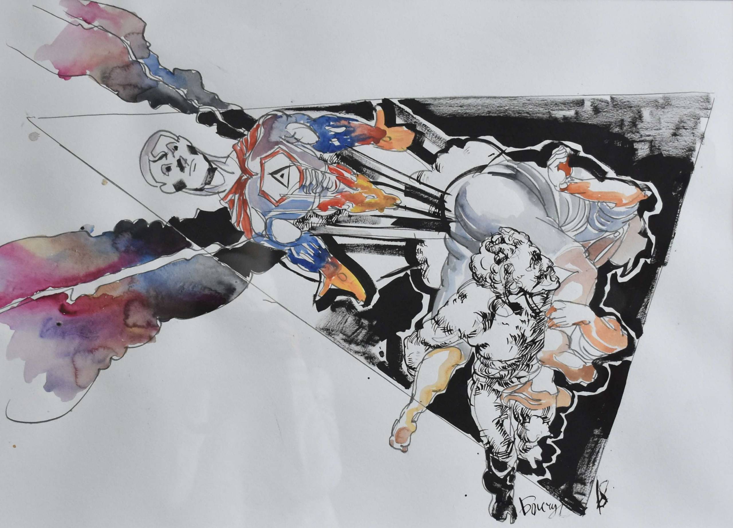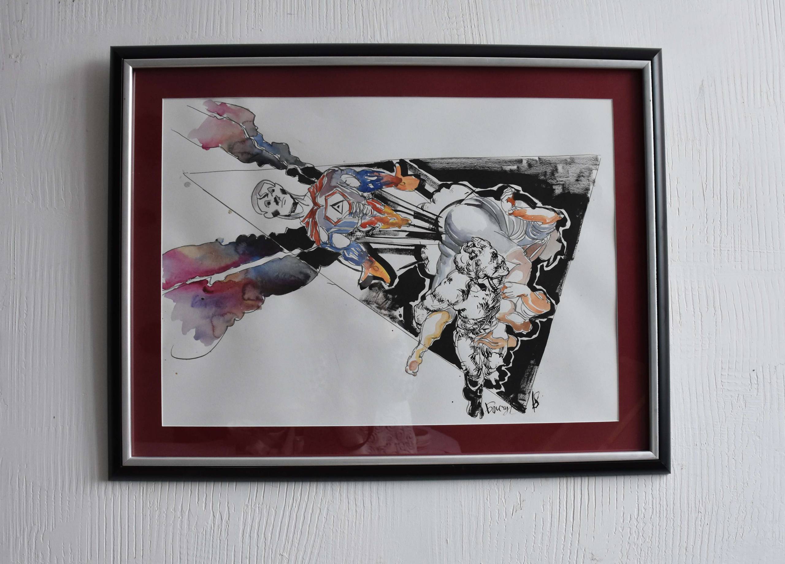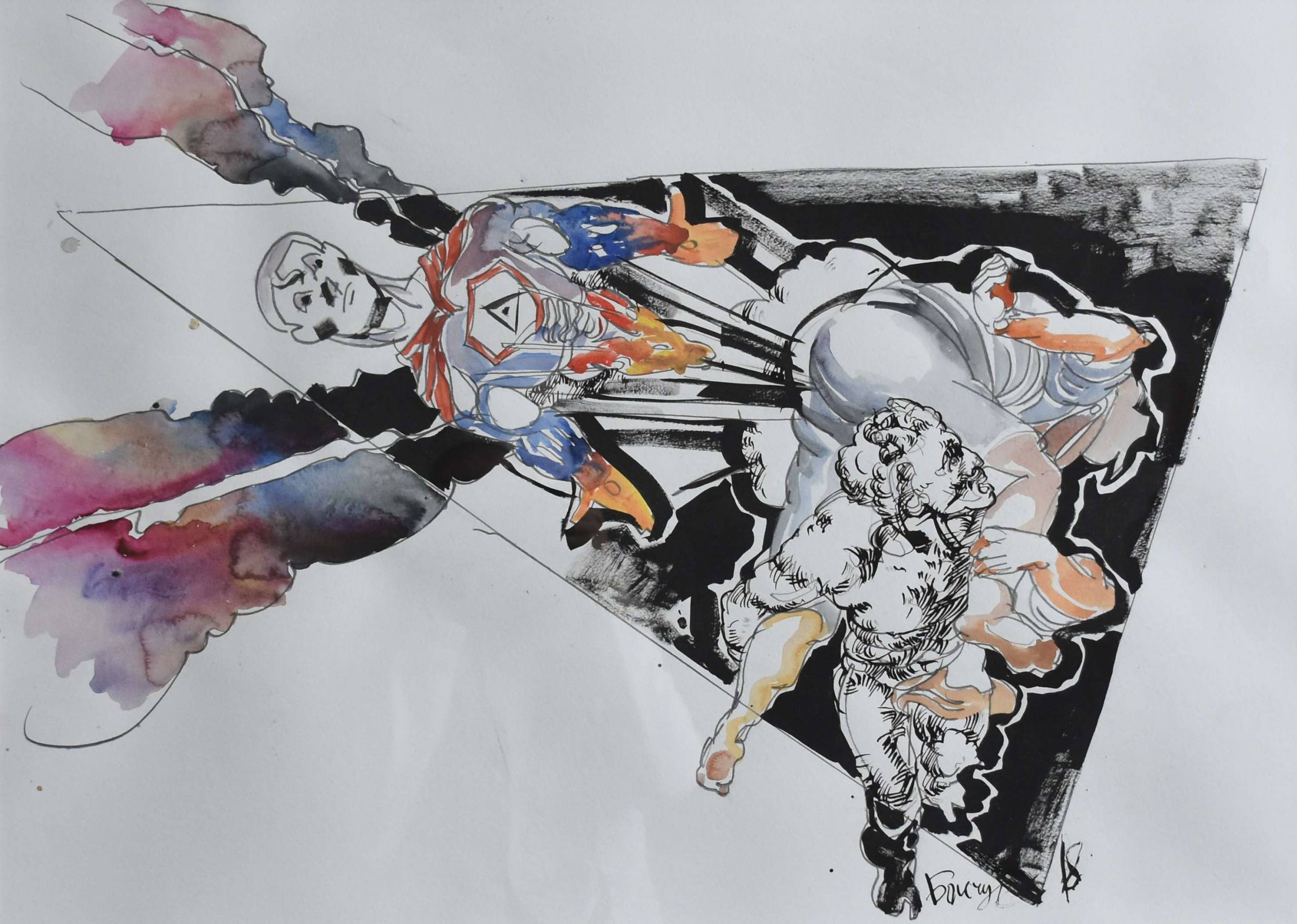 English: The Quintessential Superman… Picture size on paper: height 52 cm, width 72.5 cm In frame: height 70 cm, width 91 cm, depth 3 cm. The picture under the glass. Frame made of wood and plastic. In additional photos you find a view. As well as photo from the exhibition. The work belongs to the collection «Internal empiric» which was created in 2018. «Internal empiric» is a large series of works (more than 300), mainly of a philosophical direction. The inspiration was the books and treatises of famous thinkers. This is an attempt to comprehend complex issues and analyze the prospects of future mainstream. Look differently at axioms and see real centers. Search and find new ways of visualization. Русский: Квинтесенция сверхчеловека… Размер картины на бумаге: высота 52 см, ширина 72,5 см. В раме: высота 70 см, ширина 91 см, глубина 3 см. Картина под стеклом. Рама из дерева и пластика. На дополнительных фотографиях вы найдете вид. А также фото с выставки. Работа относится к коллекции «Внутренняя эмпирия», которая создавалась в 2018 году. «Внутренняя эмпирия» – это большая серия работ (более 300), в основном философского направления. Вдохновением послужили книги и трактаты известных мыслителей. Это попытка осмыслить сложные вопросы и проанализировать перспективы будущих мейнстримов. Взглянуть иначе на аксиомы и увидеть настоящие центры. Искать и найти новые пути визуализации.