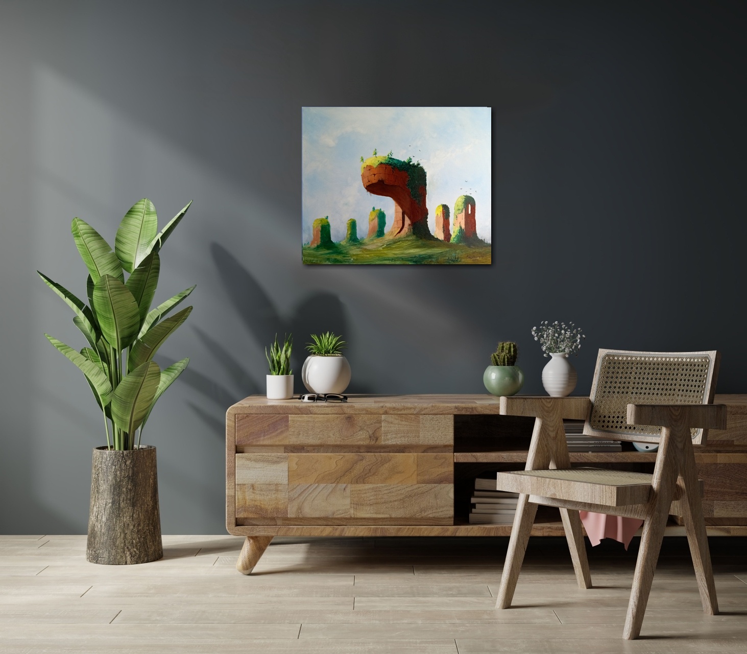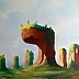 Na obrazie pojawiają się surrealistyczne, majestatyczne formacje skalne, które przypominają gigantyczne, zielone platformy unoszące się w przestrzeni. Dominują przyjemne zielenie, ciepłe brązy i błękity nieba. Całość kompozycji jest zdumiewająco harmonijna, jakby natura stworzyła cudowne miejsce, unikalne i tajemnicze. Na szczytach tych skał widać małe drzewa i krzewy, niczym miniaturowe ogrody zawieszone w powietrzu. Atmosfera obrazu jest magiczna, jakby z innego świata. Artystycznie, obraz emanuje stylem przypominającym niektóre dzieła René Magritte’a, gdzie rzeczywistość miesza się z marzeniem. Techniką wydaje się być olej na płótnie, co dodaje miękkości i głębokości kolorom. Dla siedmiolatka, to miejsce, gdzie można bawić się w chowanego wśród chmur. Patrząc na dzieło, czuje się spokój, ale też ciekawość. To jak drzwi do innego "world", pełnego tajemnic do odkrycia. Może to być metafora samotności lub oderwania od świata. Może trochę smutne, ale i z iskierką nadziei. Chciałoby się tam wskoczyć, choćby na chwilkę, posłuchać wiatru i pobiec ścieżkami, których nie ma. Co za fantazja, niebo inspirujące do snów.