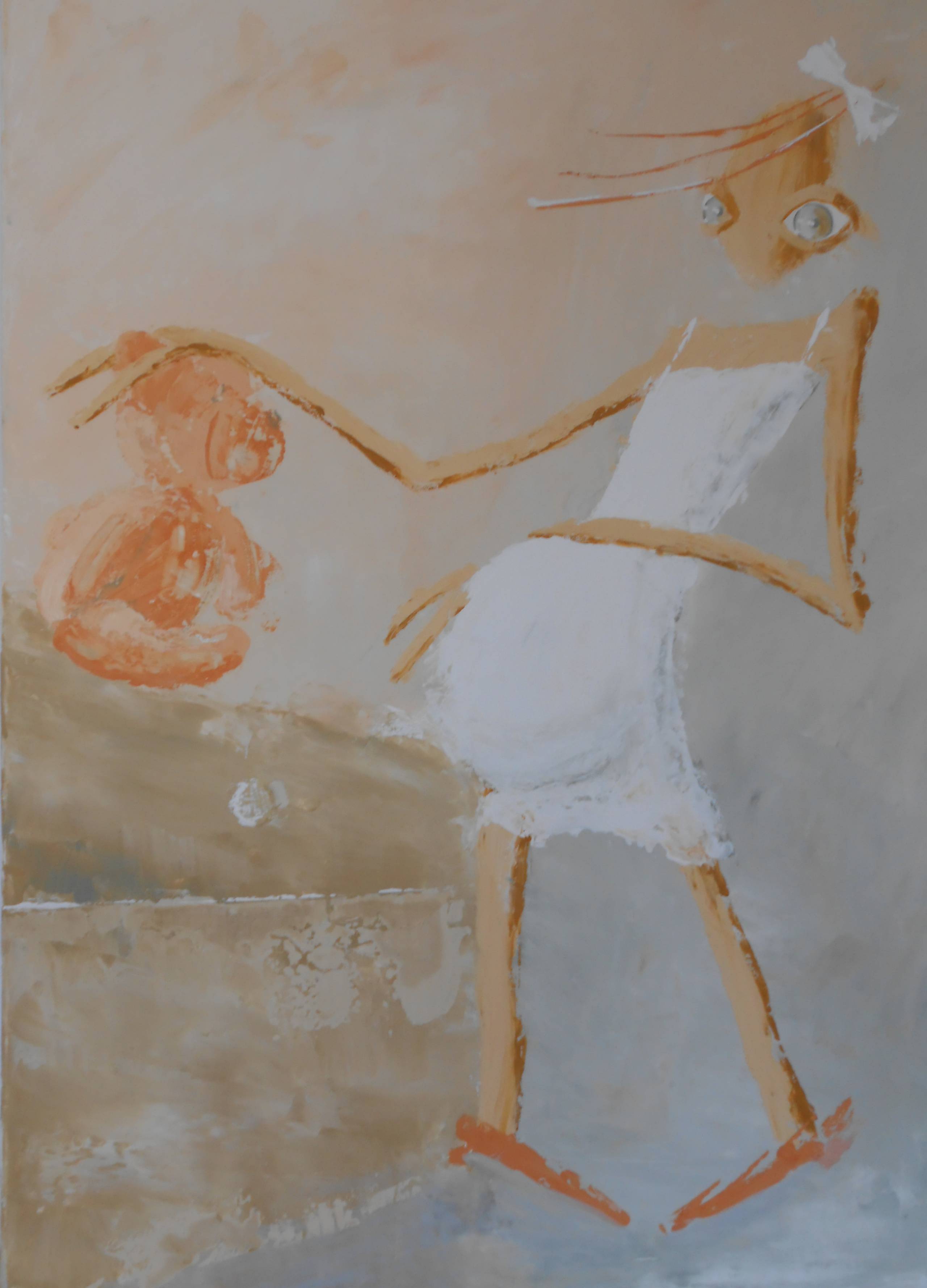 Obraz przedstawia postać o prostych, wydłużonych kształtach, ubranej w białą sukienkę. Kolory pasteli – głównie kremowe i pomarańczowe – dominują kompozycję, nadając jej miękki, ciepły klimat. Postać wyciąga rękę w stronę niedźwiadka o podobnych odcieniach. Tło jest minimalistyczne, niemal płaskie, co sprawia, że widz skupia się na centralnym elemencie dzieła. Trochę jakby ktoś naszkicował coś w notesiku, ale wpadło to do świata malowideł. Atmosfera jest lekka, niemal dziecięca, wywołując uczucie nostalgii. Szorstkie pociągnięcia pędzla i uproszczone formy wskazują na styl zbliżony do ekspresjonizmu. To jak w bajkach, gdzie wszystko jest możliwe! Obraz może wzbudzać w odbiorcy uczucie spokoju, jakby czas zatrzymał się na chwilę. Jest w tym coś magicznego, choć prozaicznego – ot, zwykła scenka, zanim zasypiasz. "Sweet simplicity" mogłoby pasować jako opis tego dzieła. Czy to marzenie senne, czy migawka wspomnień z dzieciństwa? Warto się nad tym zastanowić, patrząc na ten obraz.