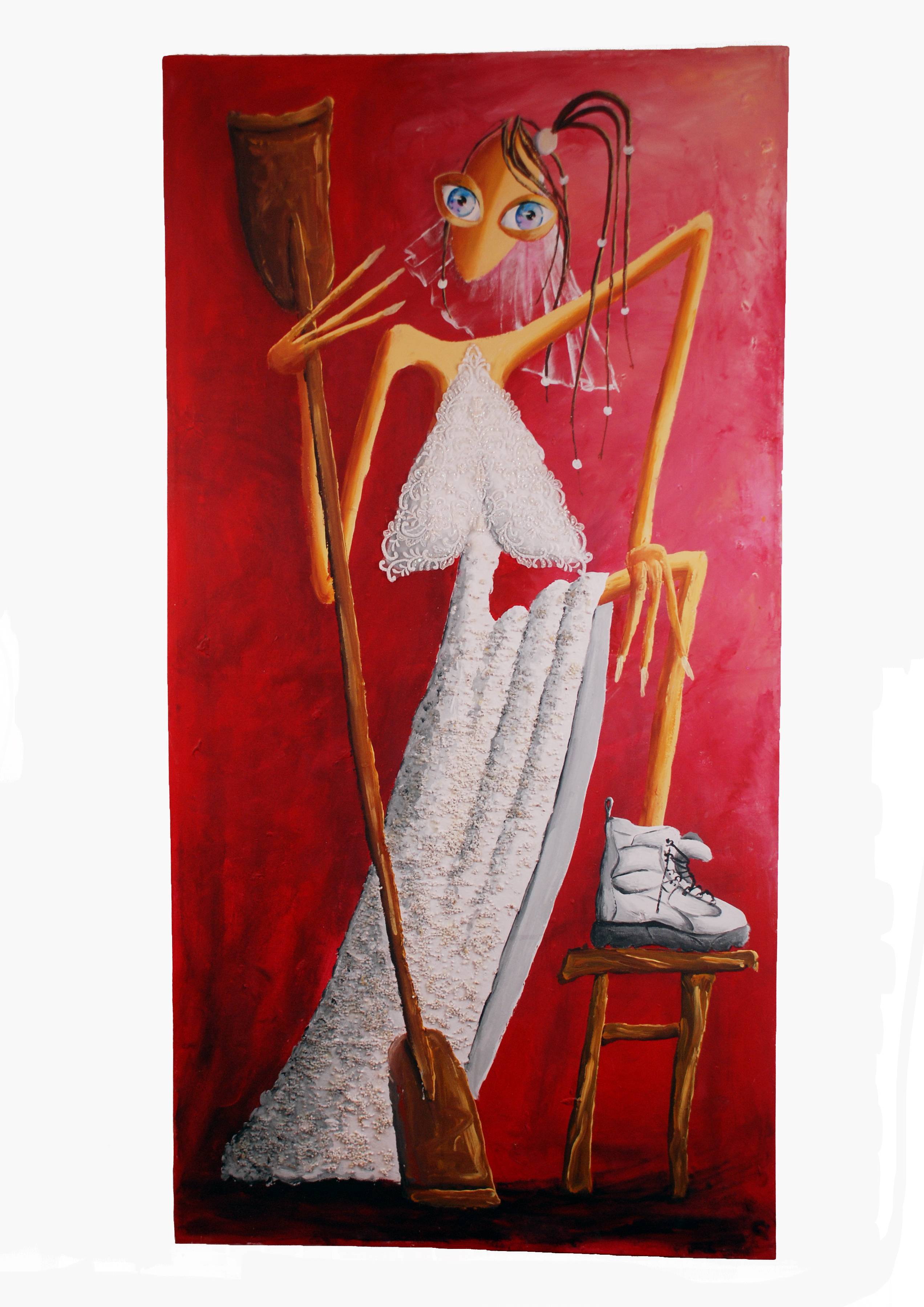 collage. Górna część sukni to koronka z perełkami,dolna część sukni posiada grubą, ziarnistą fakturę.